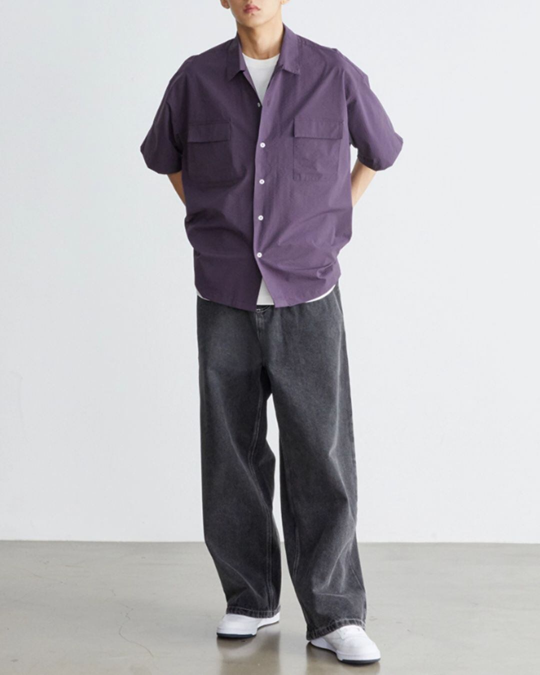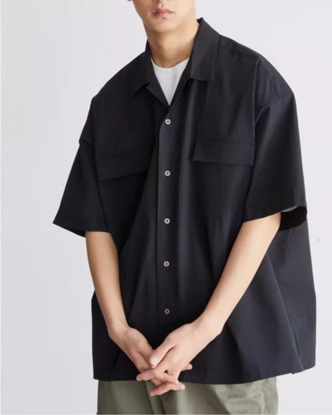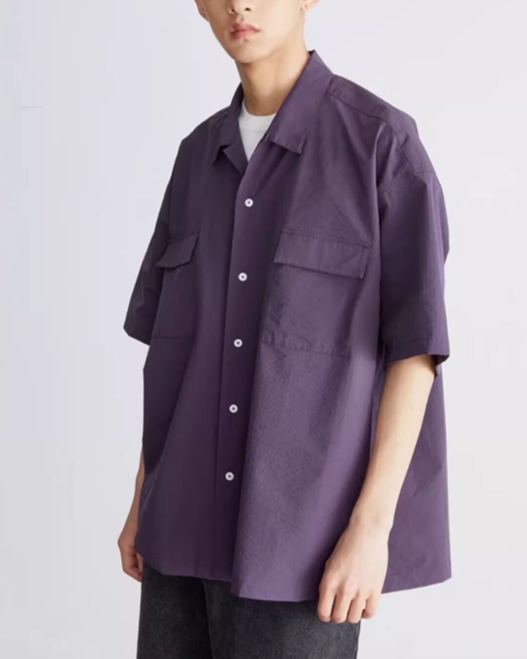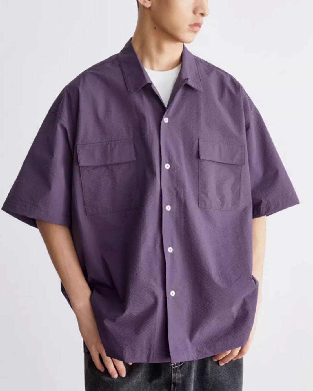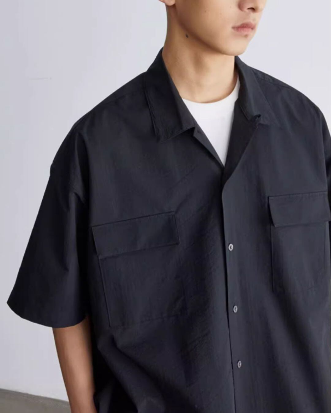 着やすさとデザイン性を両立した、おすすめのショートスリーブシャツです。オープンカラーで抜け感を出しつつ、ボックスシルエットで程よいリラックス感を演出。