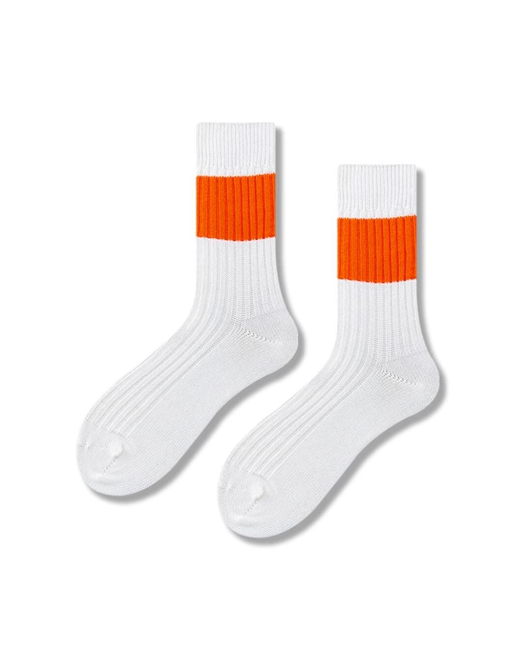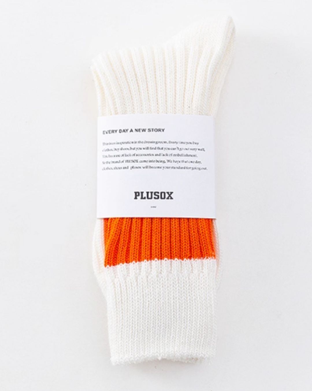 着こなしにさりげないアクセントを加えるクルーソックス。オレンジのラインが、シンプルなスタイルにアクセントをプラス。