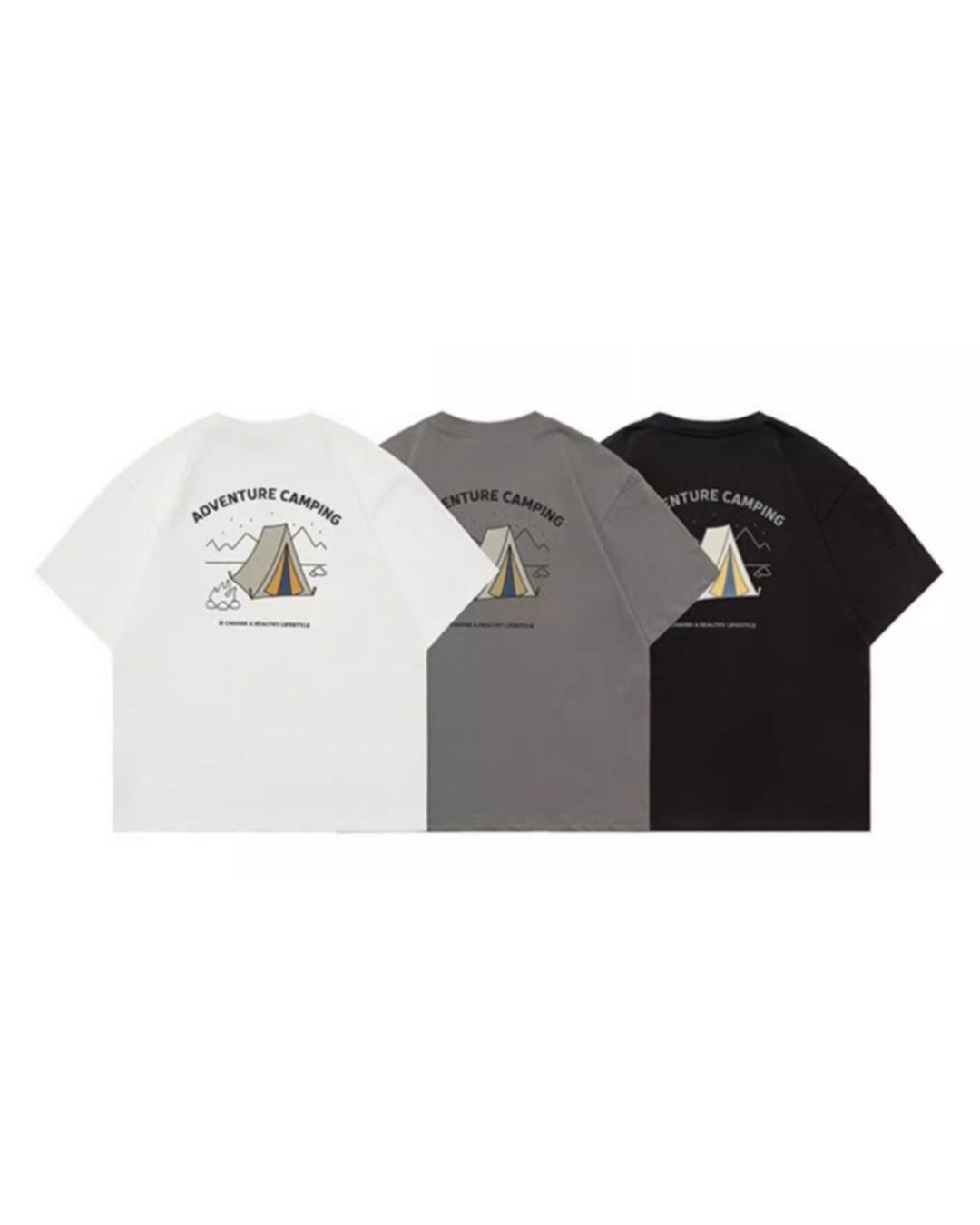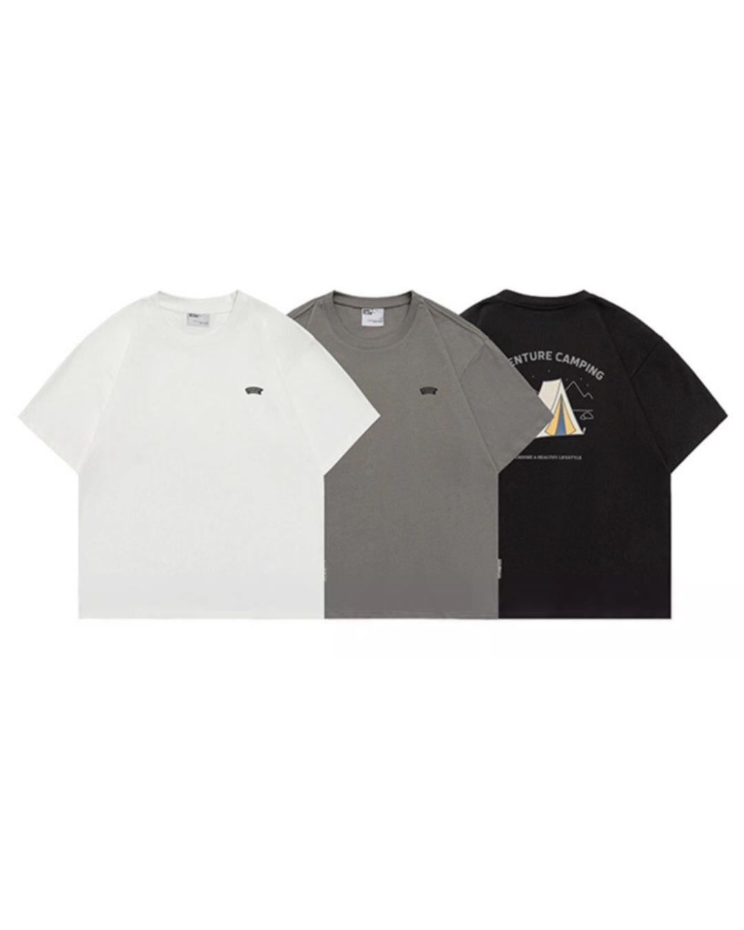 バックプリントにキャンプモチーフがデザインされたクルーネック半袖Tシャツです。ボックスシルエットでゆったりと着こなせるデザインが魅力です。