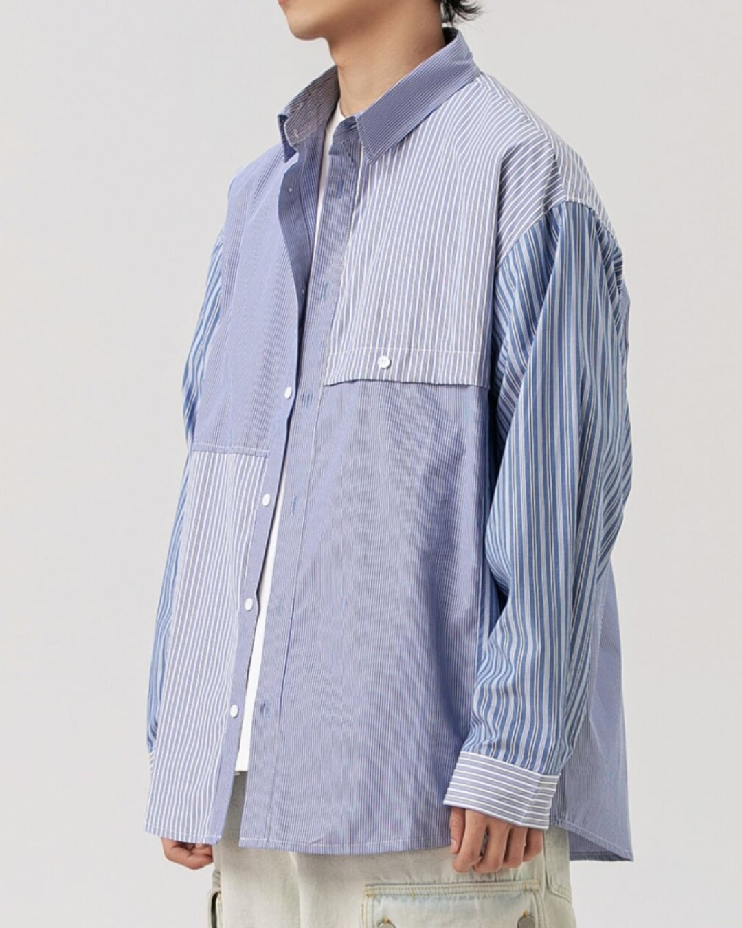 パッチワークストライプ柄のロングスリーブシャツは、着こなしに遊び心をプラスする一枚です。異なるストライプ柄のパネルを組み合わせたデザインが、シンプルながらも目を引く存在感を放ちます。
