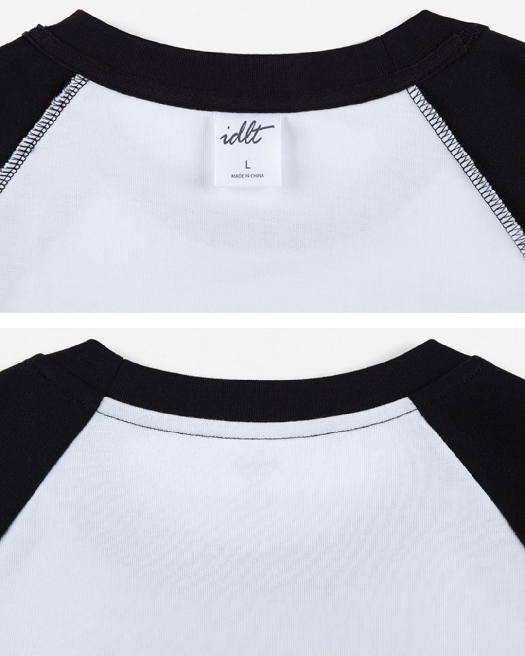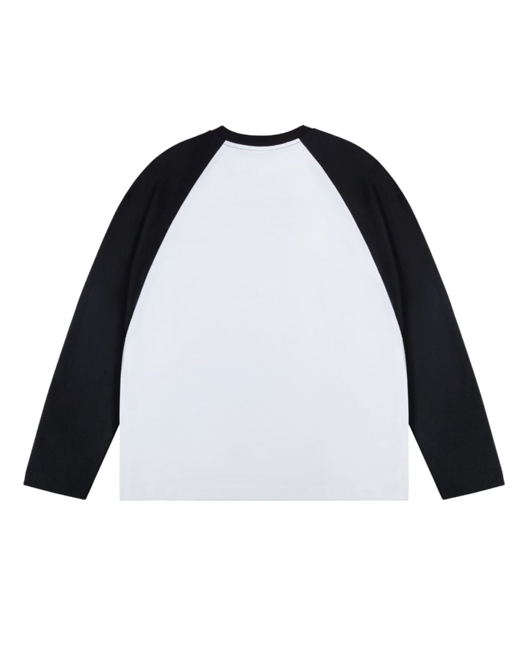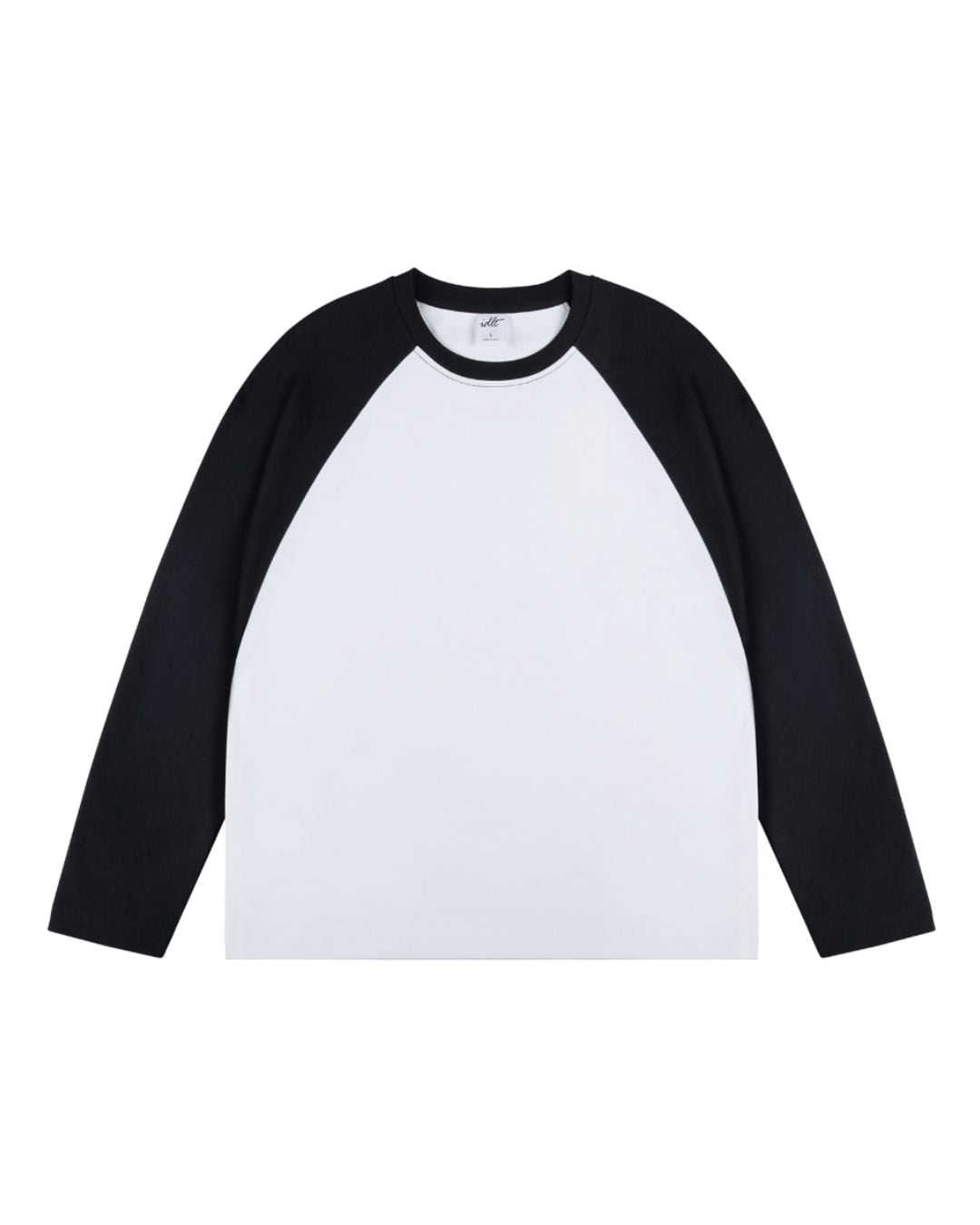 シンプルながらも洗練されたデザインが魅力のラグランスリーブクルーネックTシャツ。ホワイトのボディにブラックのラグランスリーブが映え、カジュアルながらもスタイリッシュな印象を与えます。