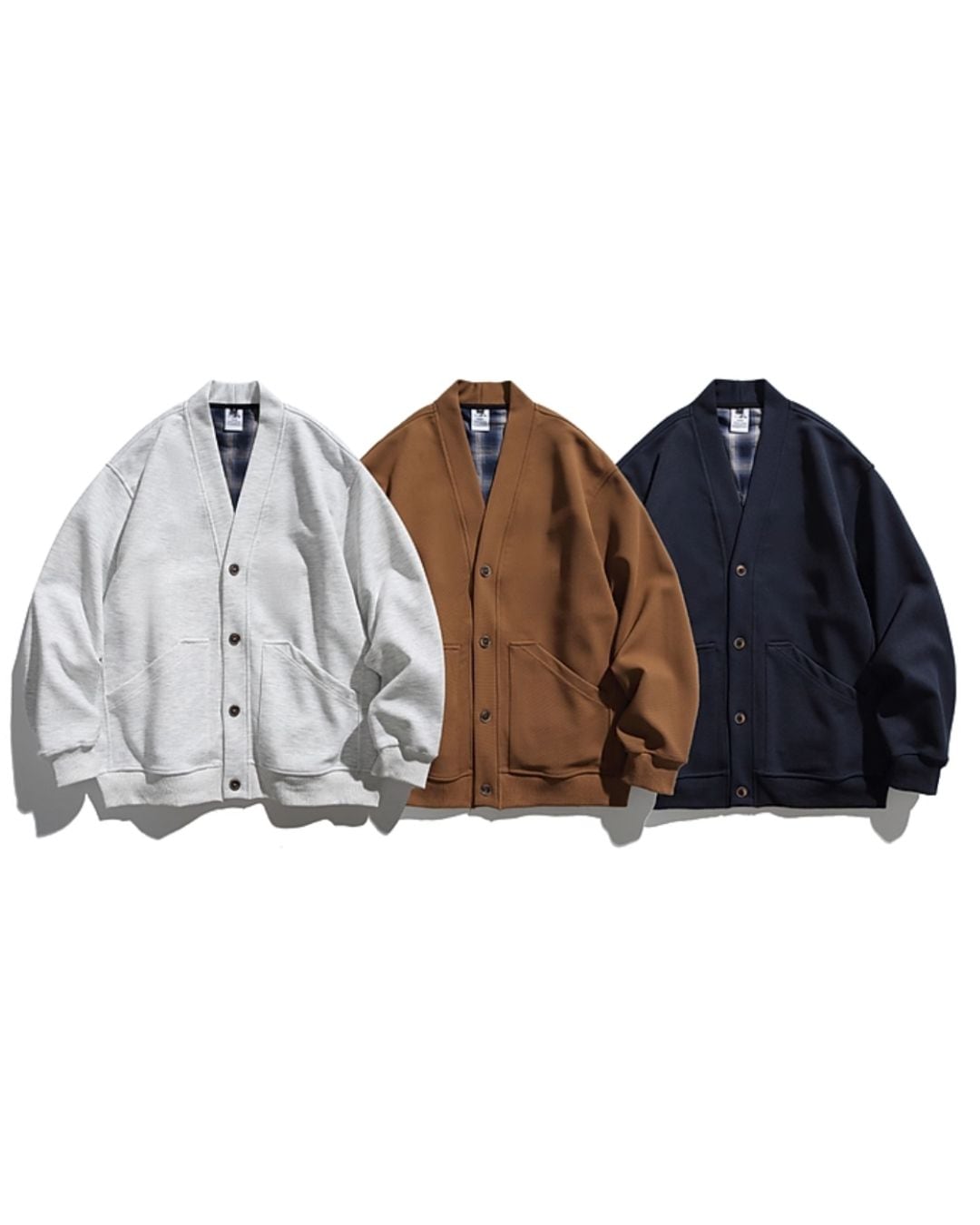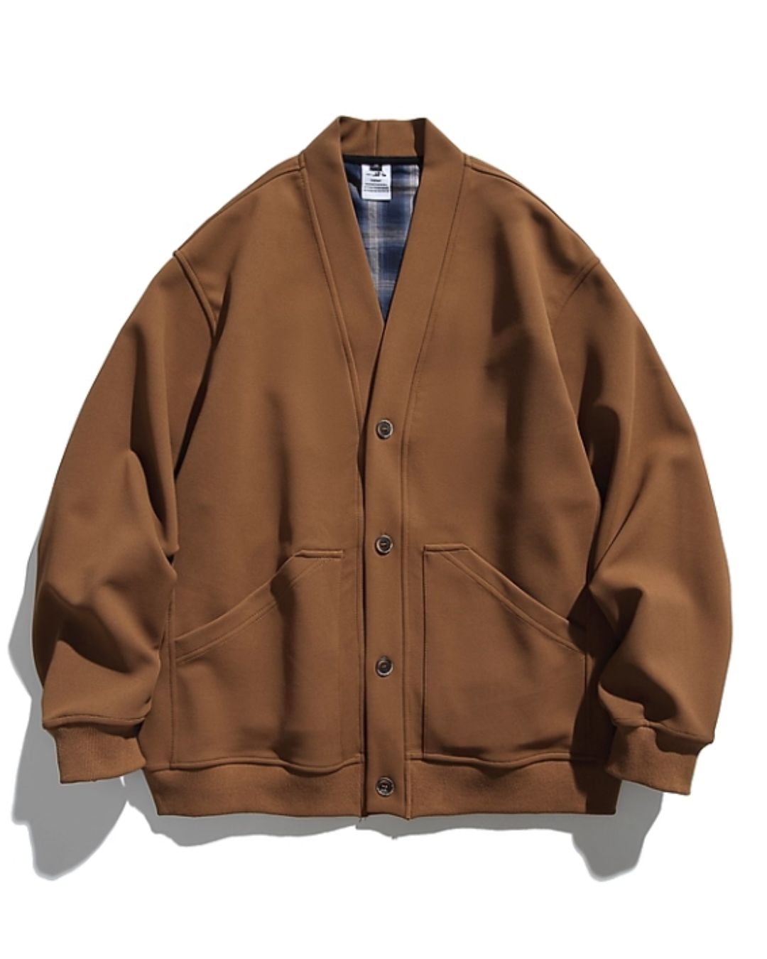 Vネックのデザインが洗練された印象を与えるカーディガンです。さりげなく覗く裏地のチェック柄が、シンプルながらも個性を演出します。