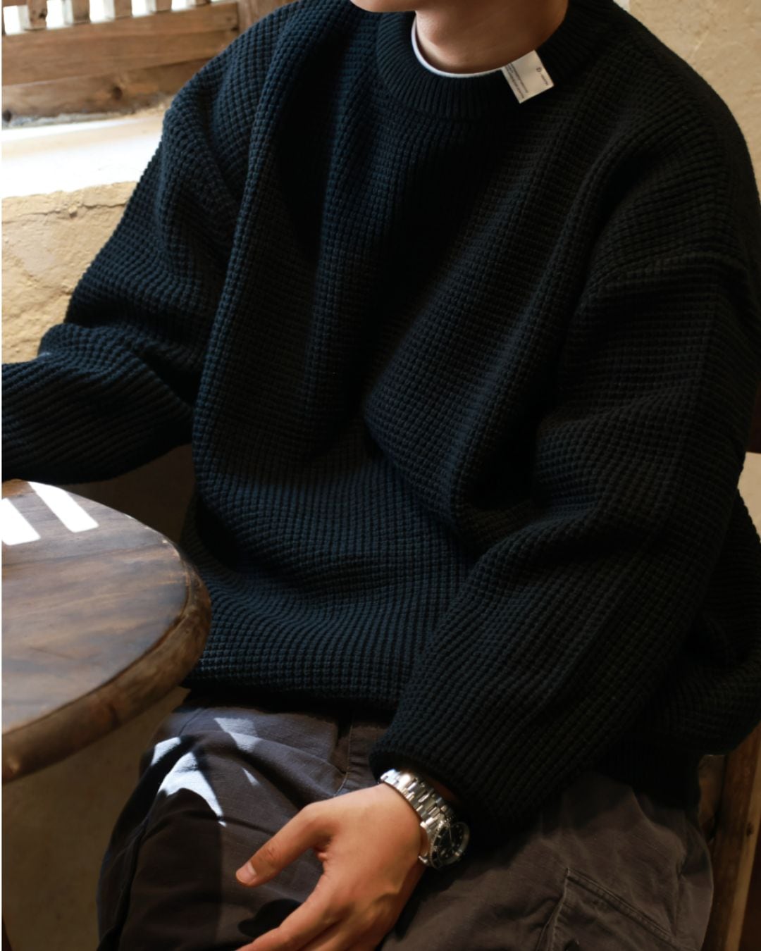 ざっくりとしたワッフル編みが特徴的なセーター。カジュアルな普段使いはもちろん、落ち着いた色合いなので、少し上品なスタイルにも合わせやすい汎用性の高い一着です。