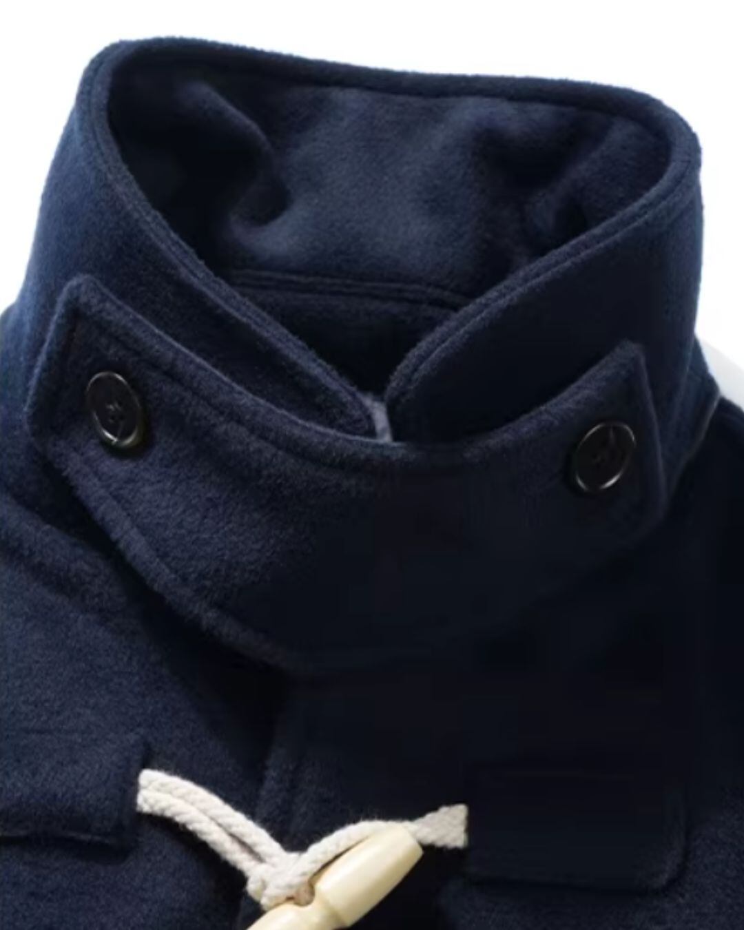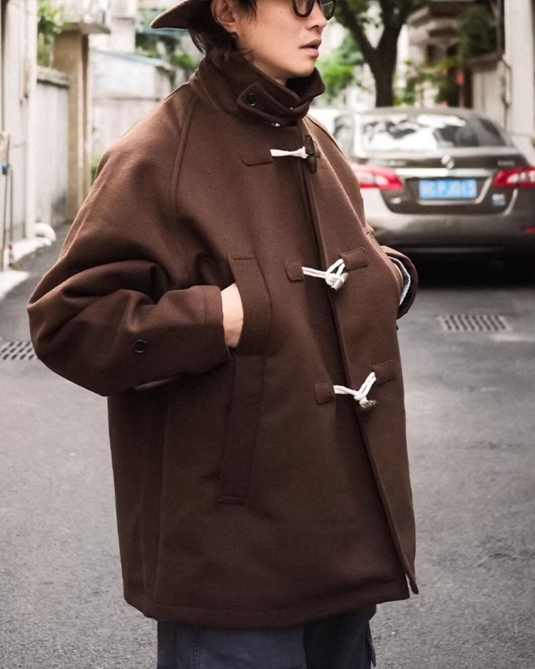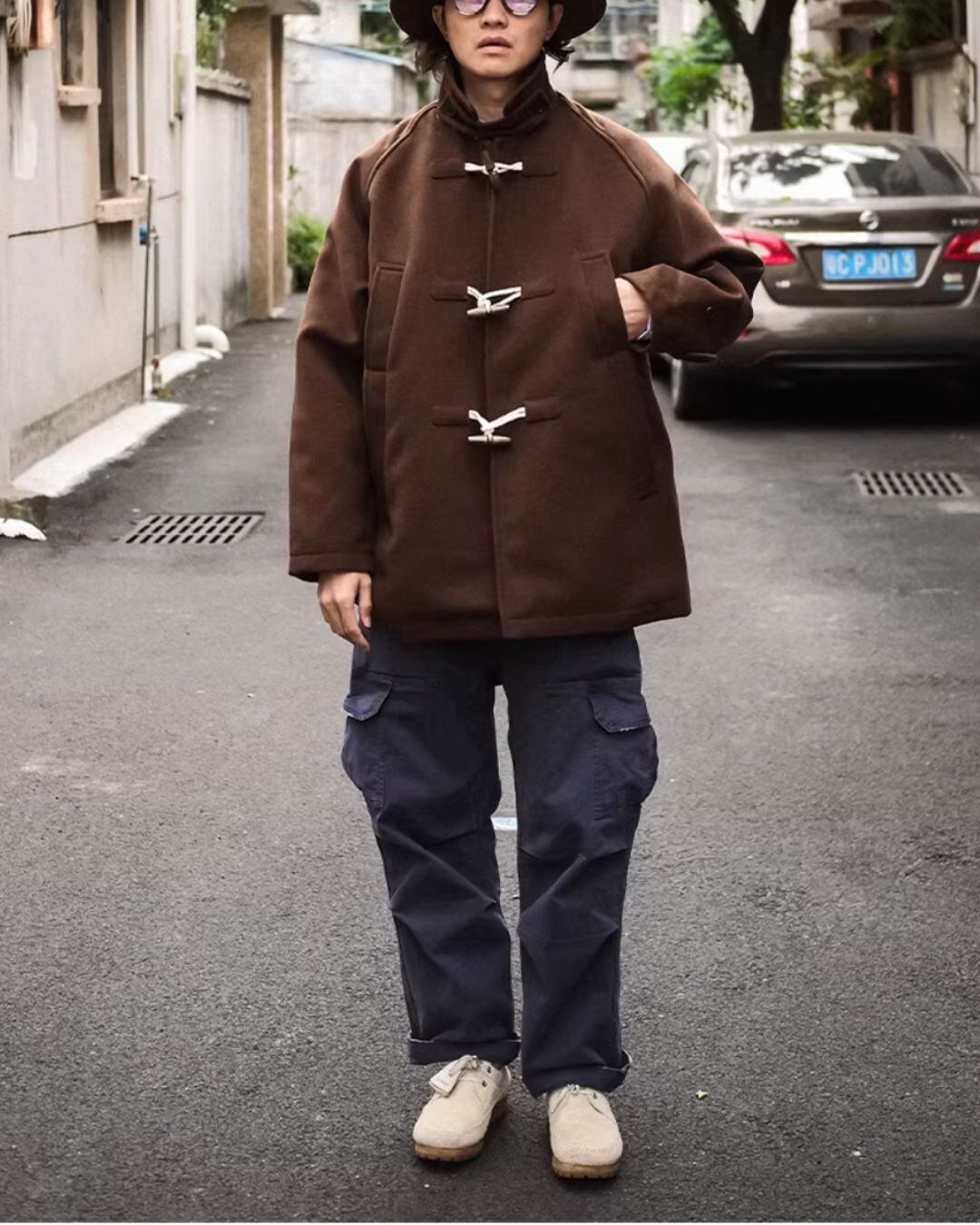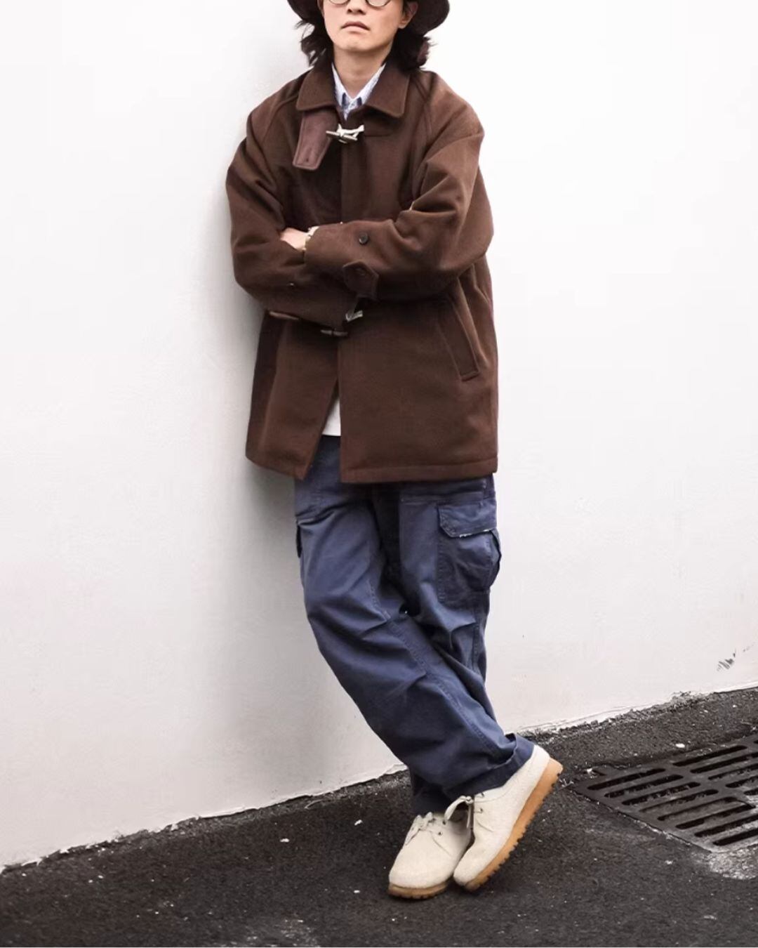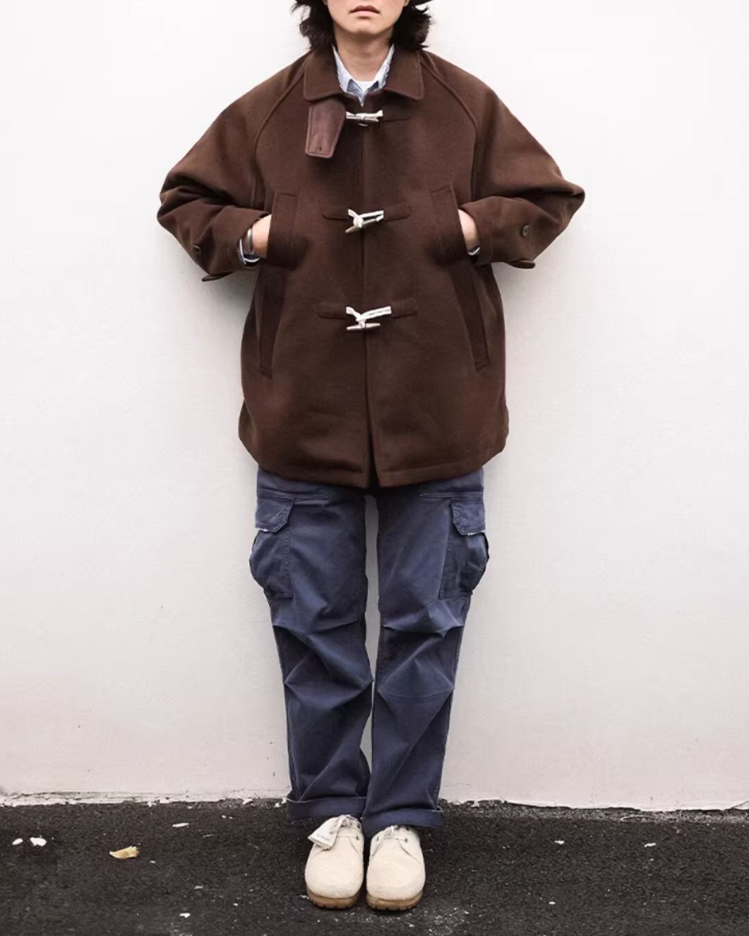 トグルボタンが特徴的な腰丈の長袖ダッフルコートです。カジュアルな普段使いにはもちろん、少し肌寒い日の軽めのアウターとしても重宝します。