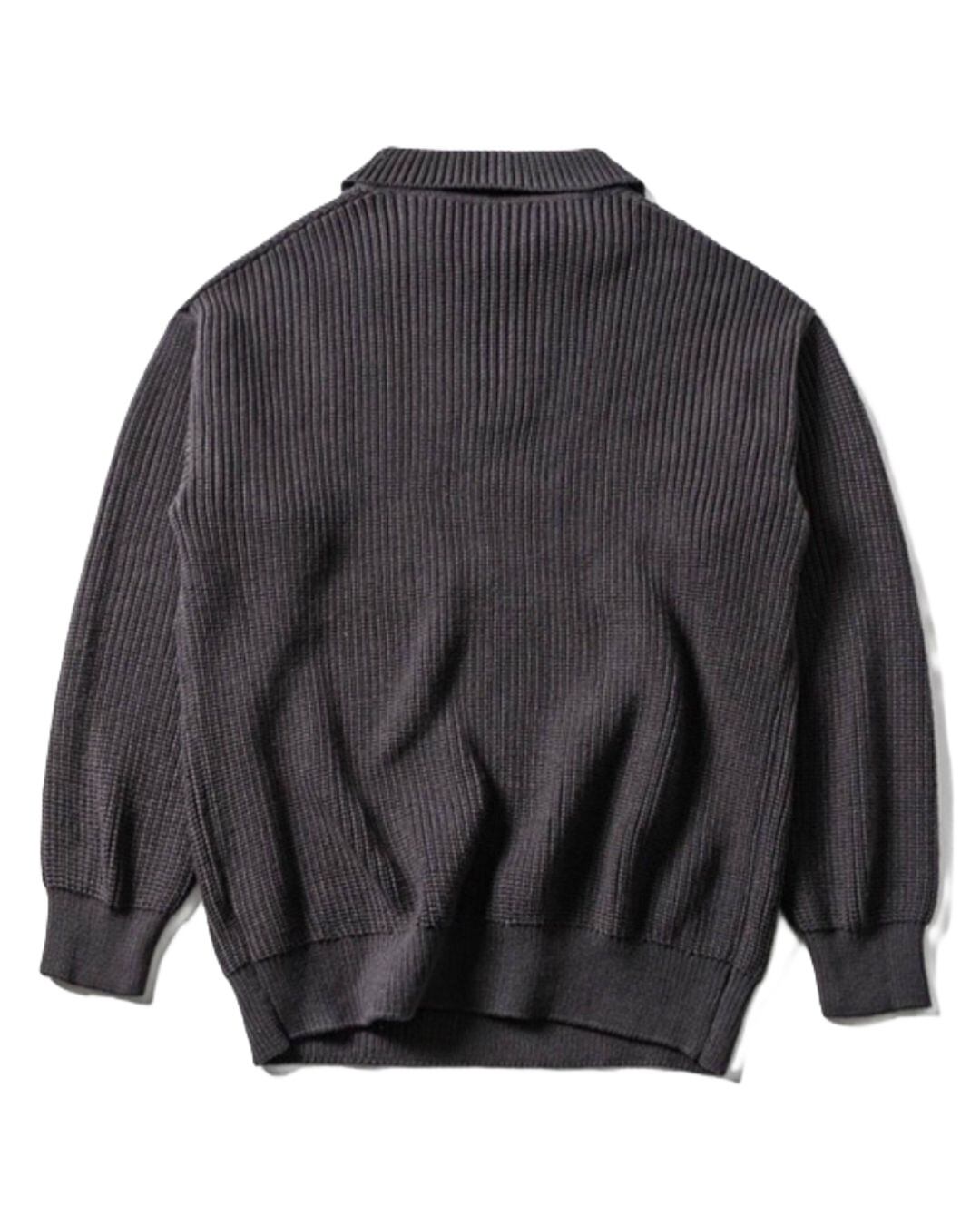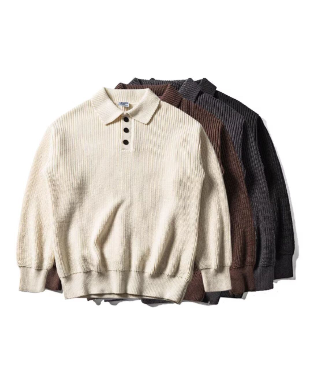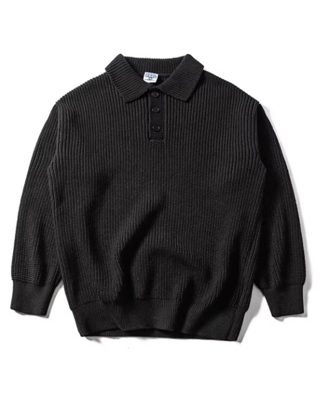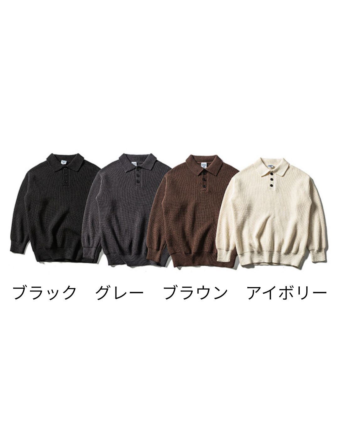 リブ編みが特徴的なセーター。ポロカラーのデザインが、カジュアルながらも上品な印象を与えます。