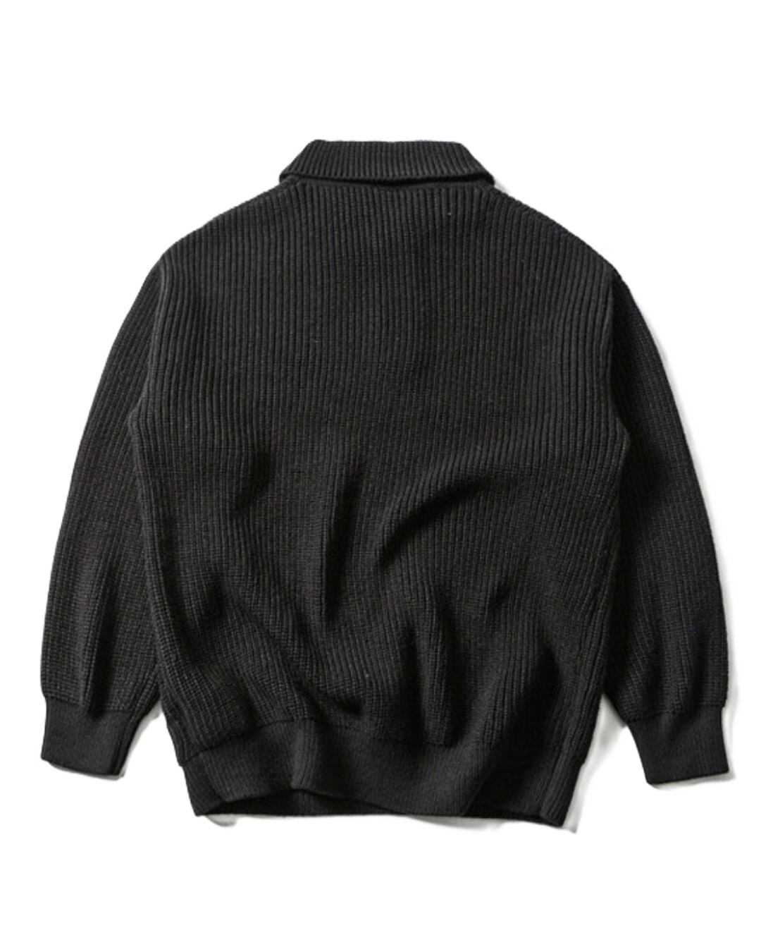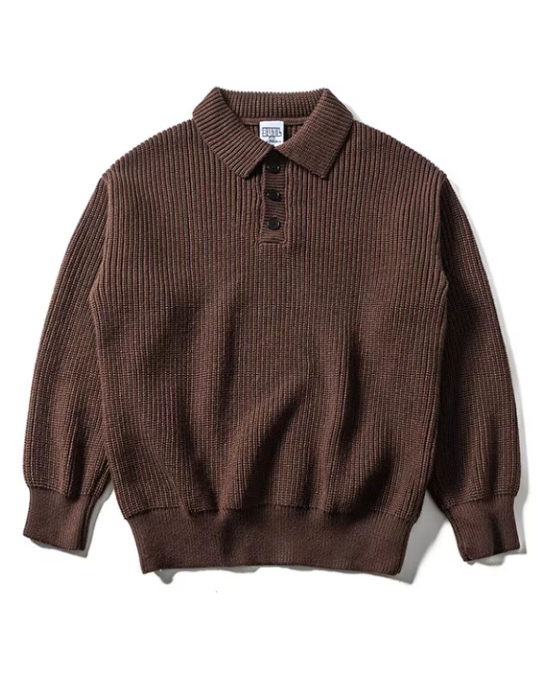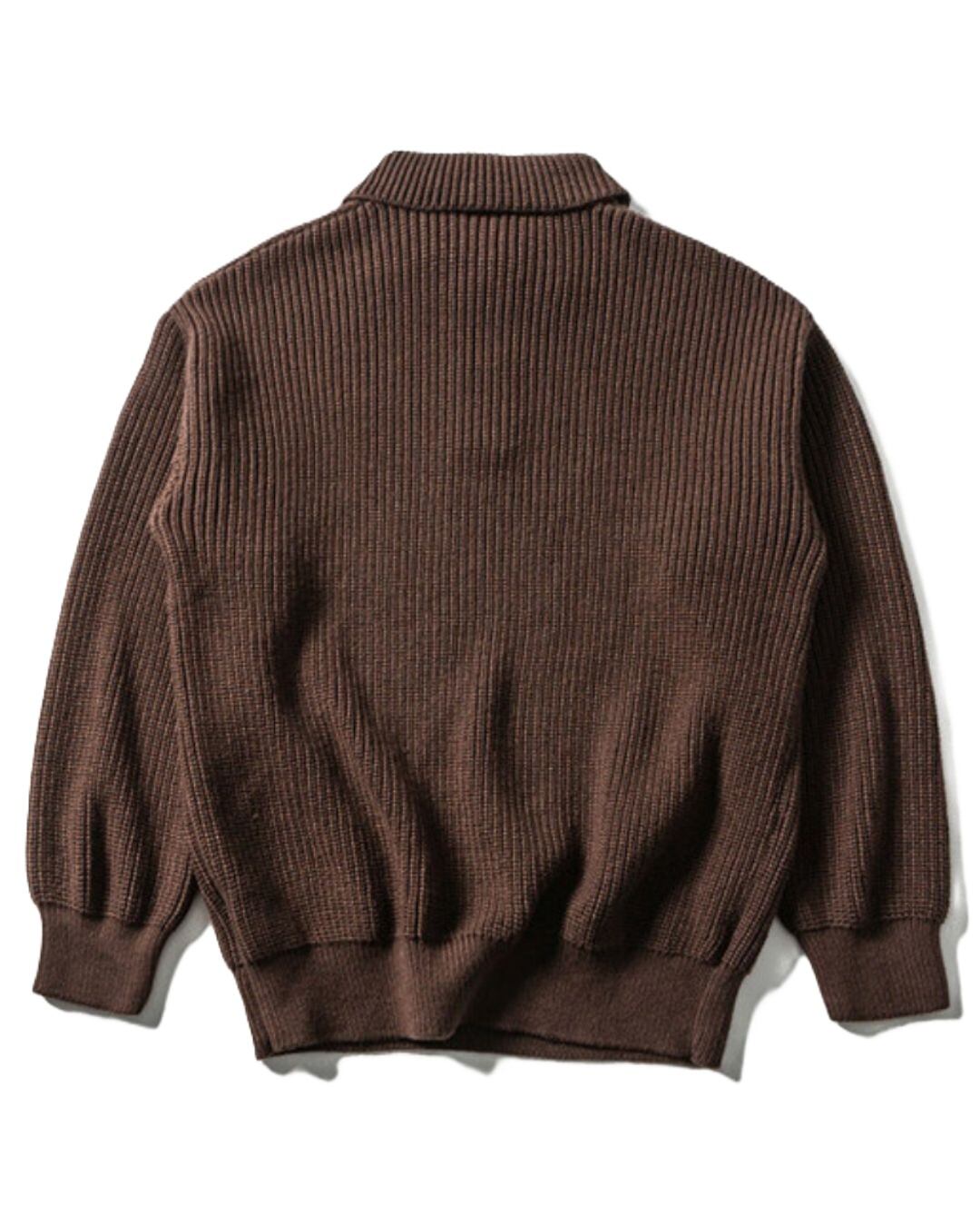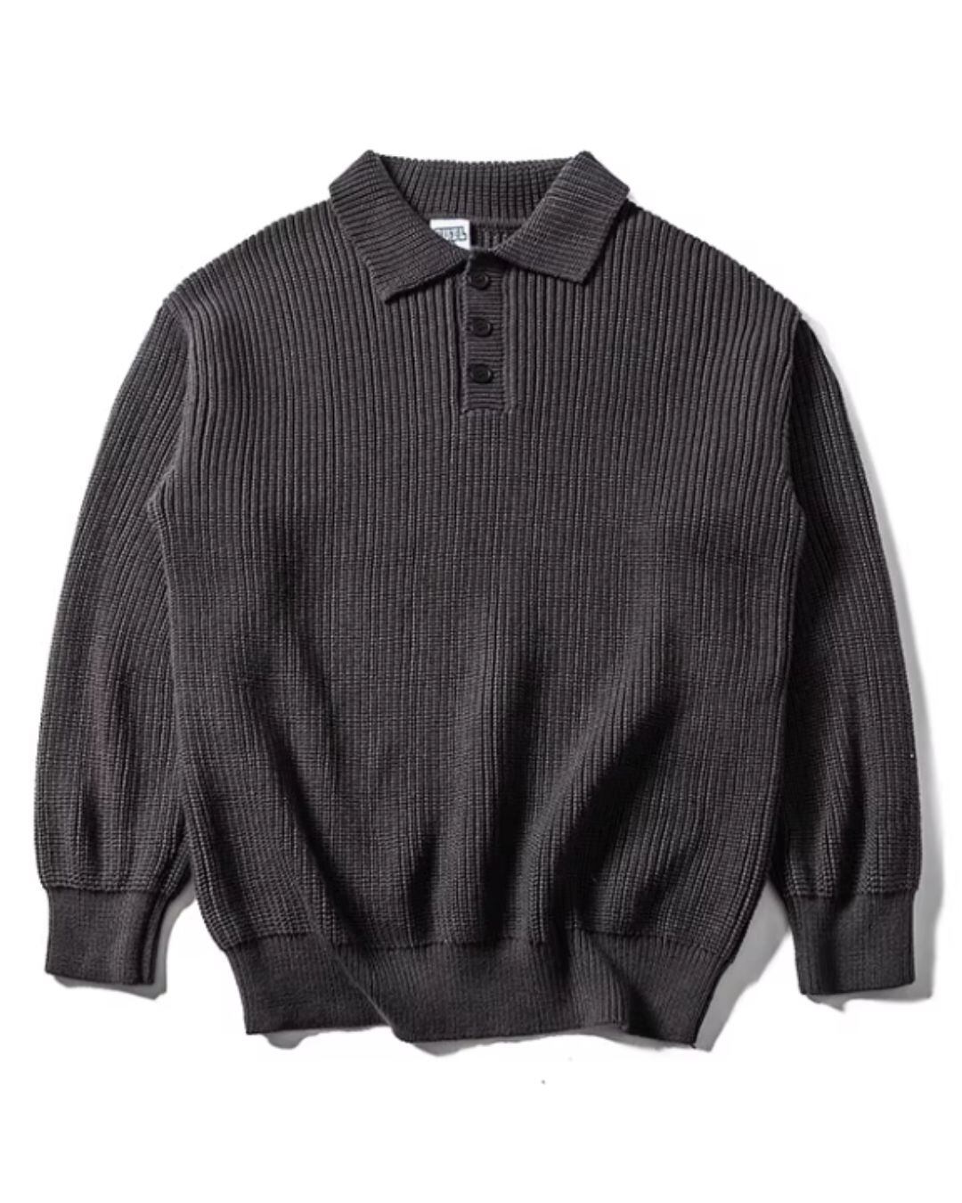 リブ編みが特徴的なセーター。ポロカラーのデザインが、カジュアルながらも上品な印象を与えます。