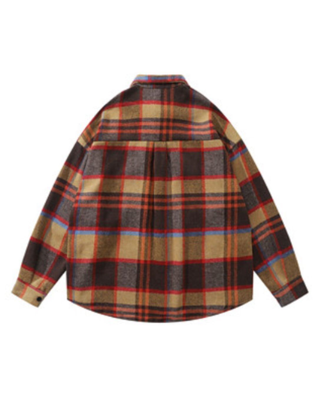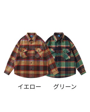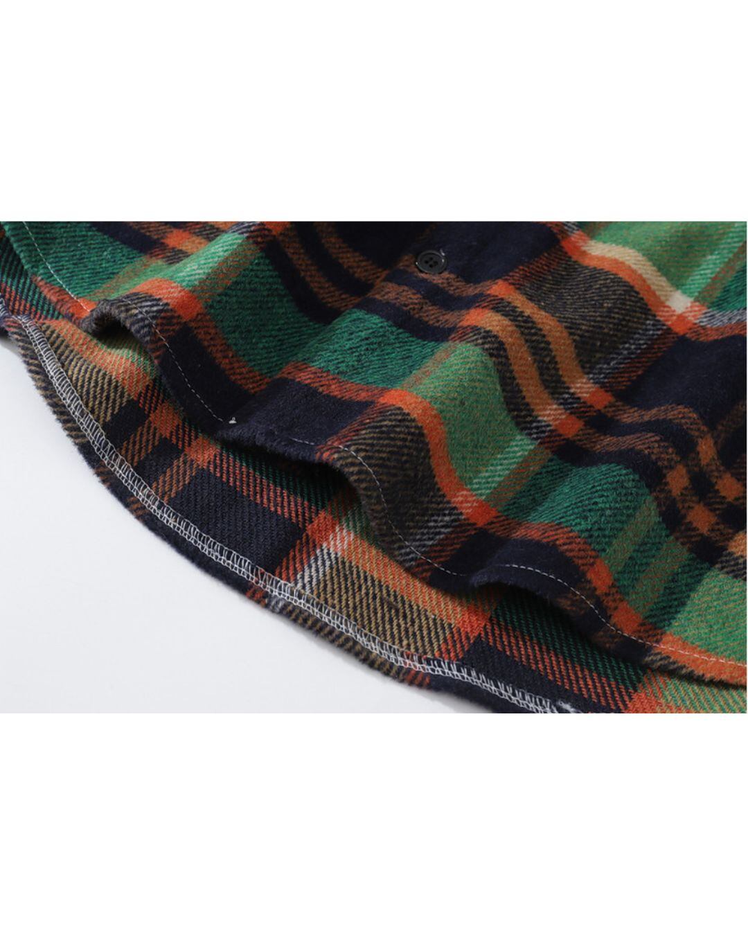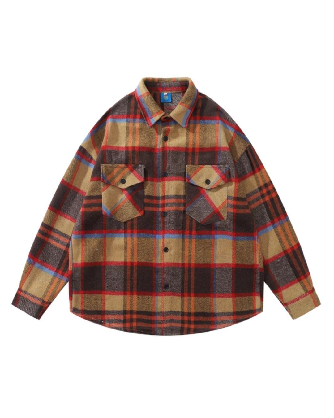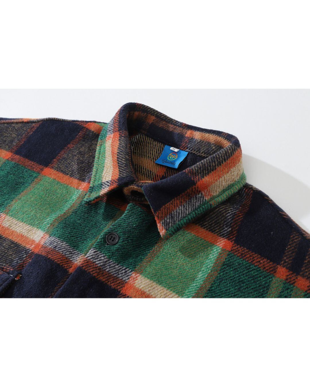 レトロな配色が目を引くカラーブロックチェックシャツ。落ち着いた色合いのチェック柄は、カジュアルながらも大人の雰囲気を演出します。