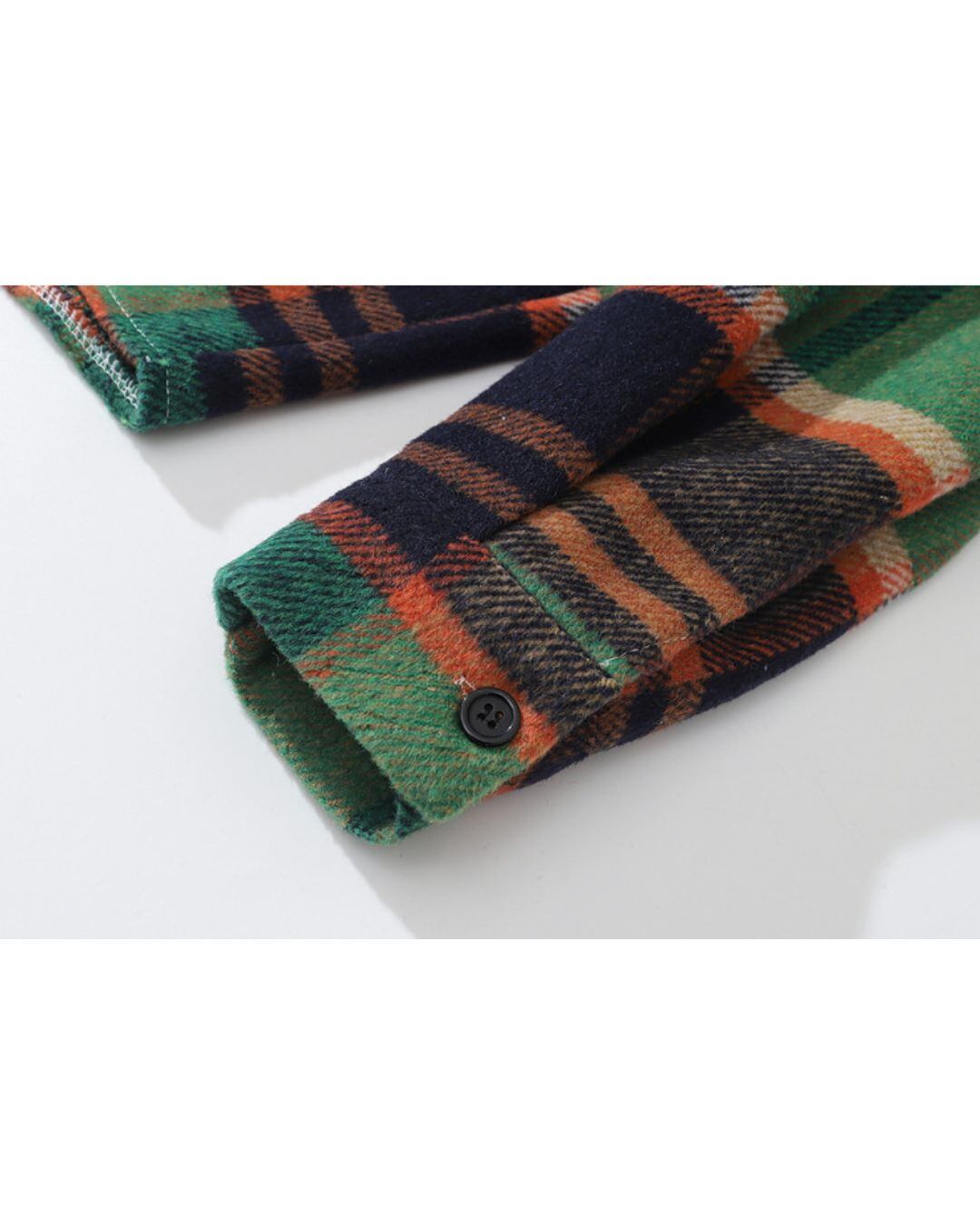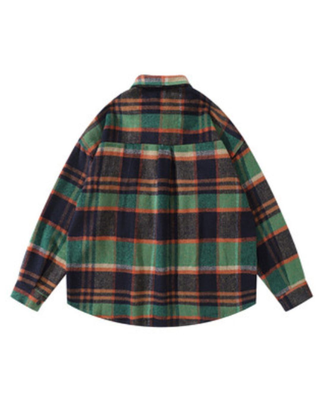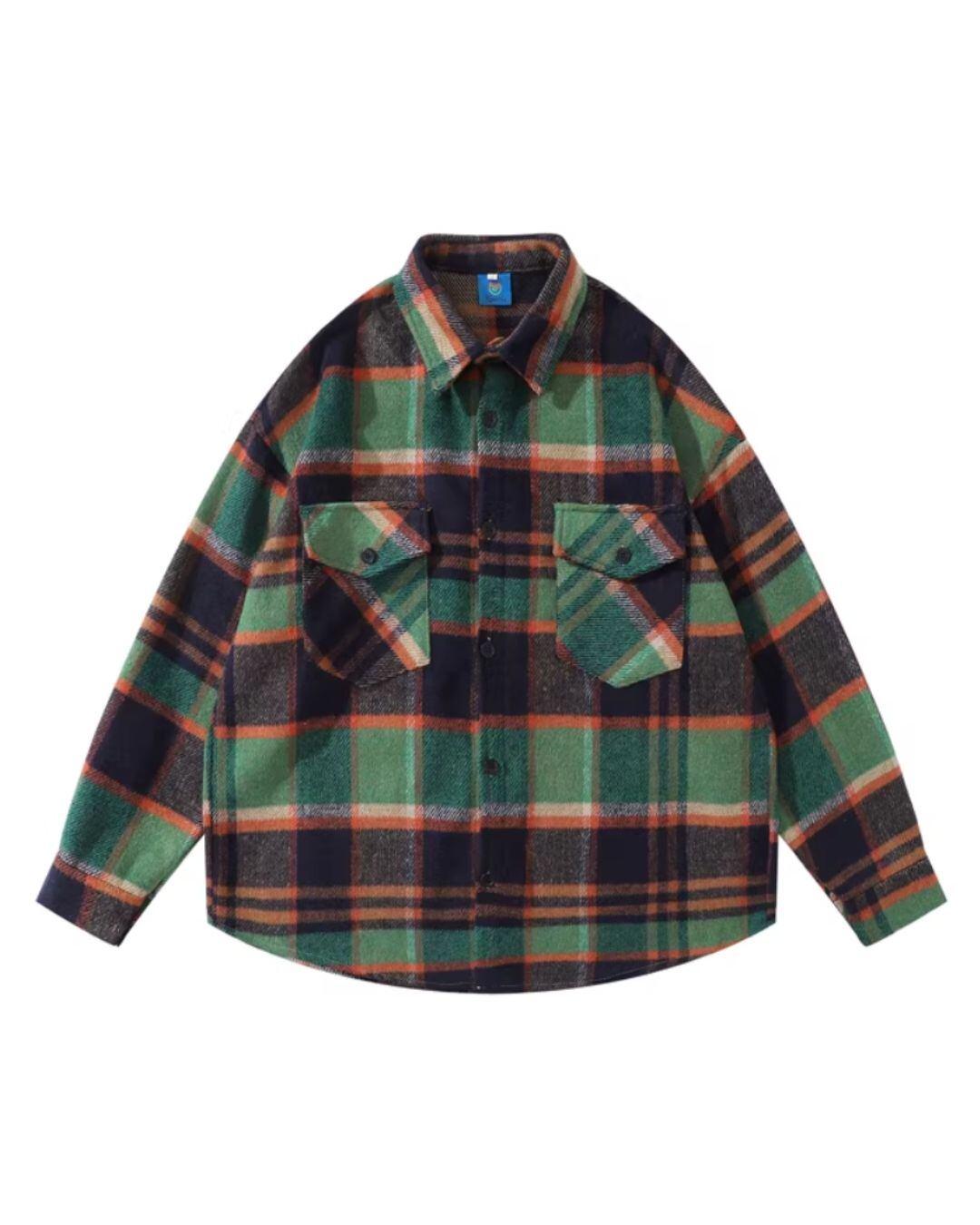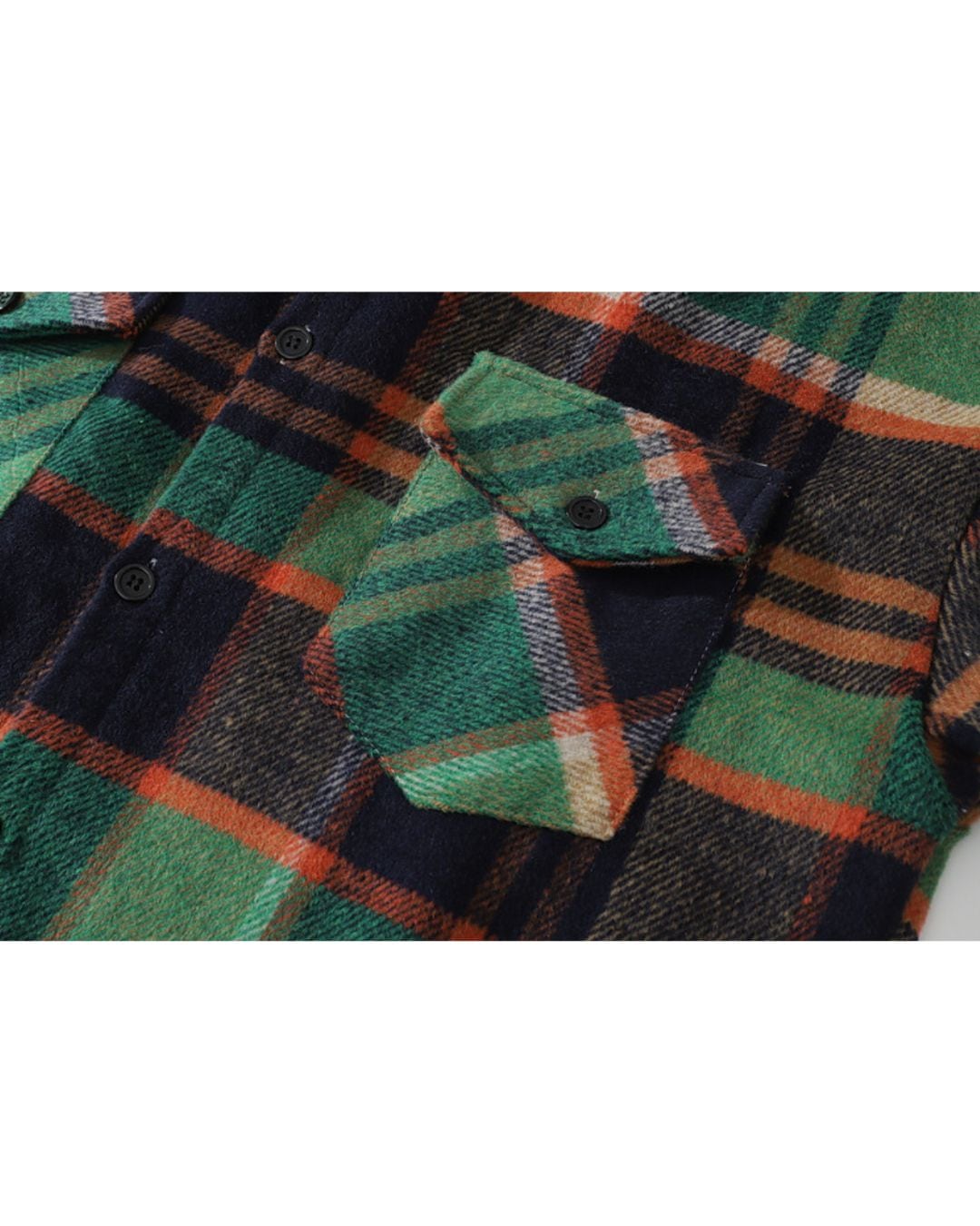 レトロな配色が目を引くカラーブロックチェックシャツ。落ち着いた色合いのチェック柄は、カジュアルながらも大人の雰囲気を演出します。