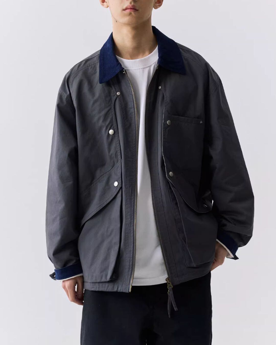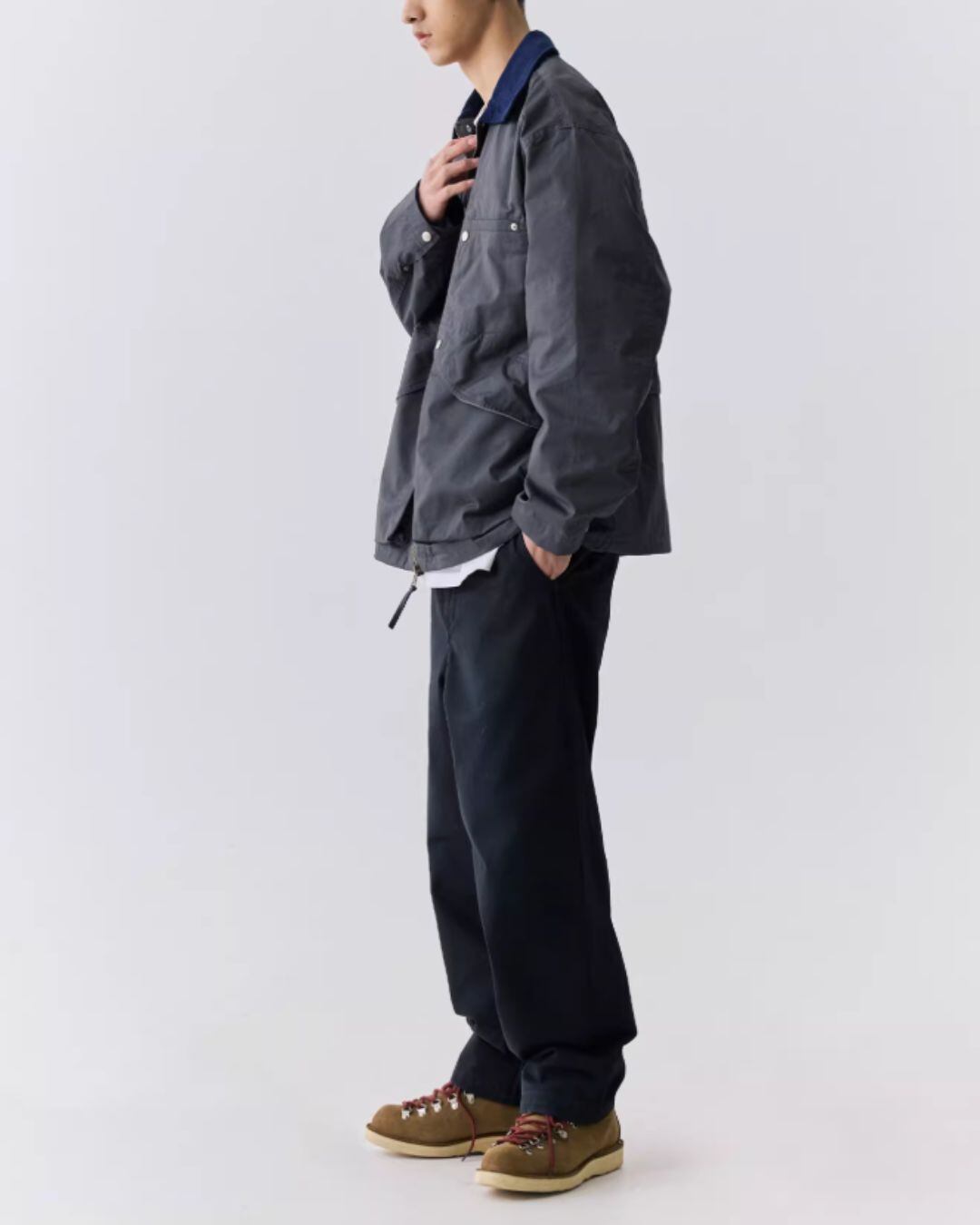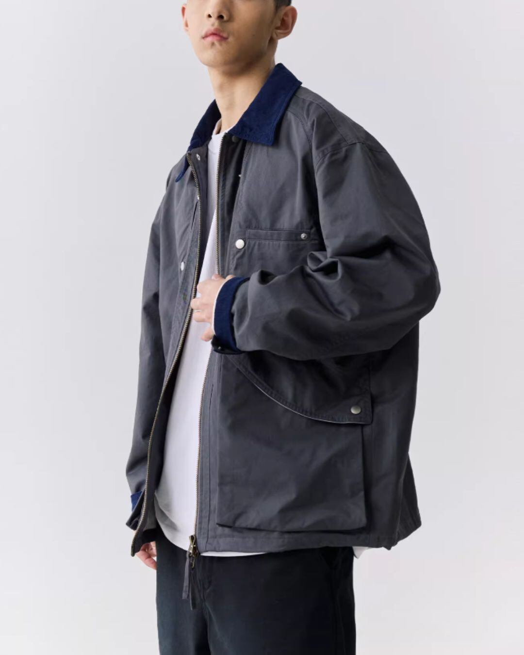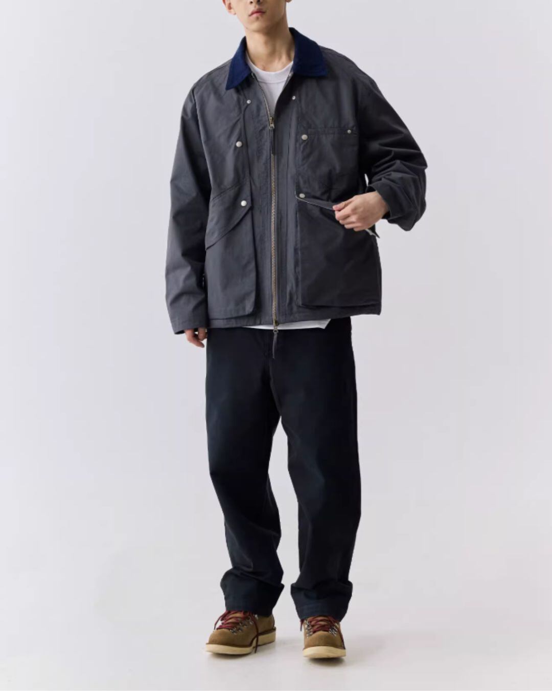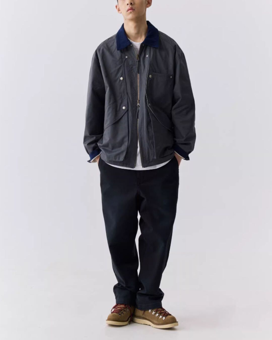 ラペルデザインが特徴的なハンティングジャケット。フロントのフラップ付きポケットは収納力が高く、デザインのアクセントにもなっています。
