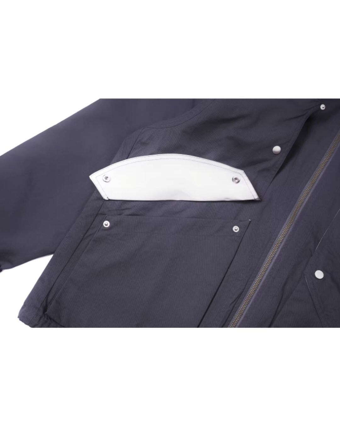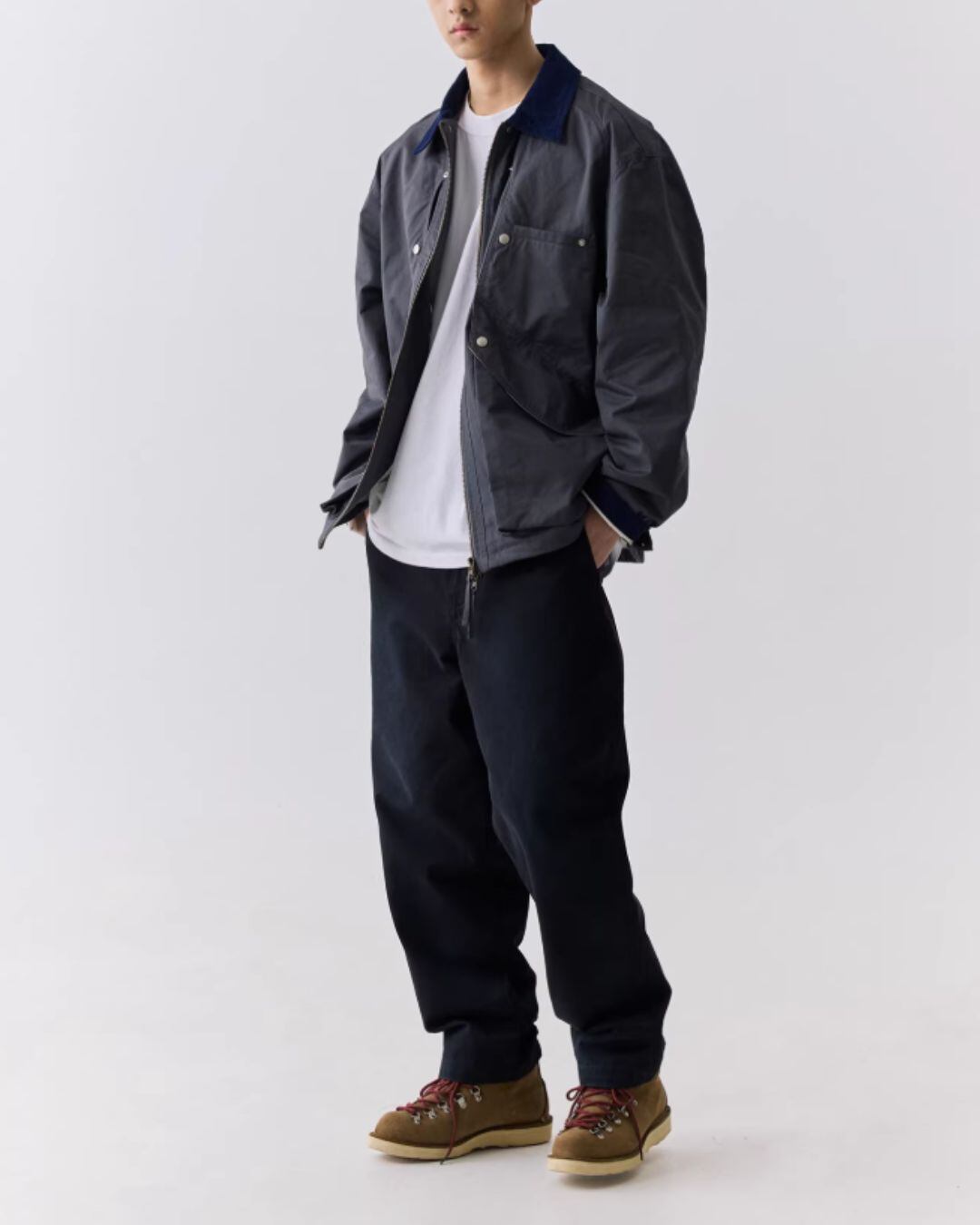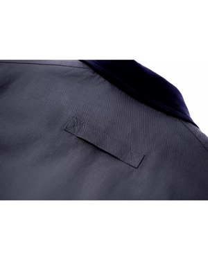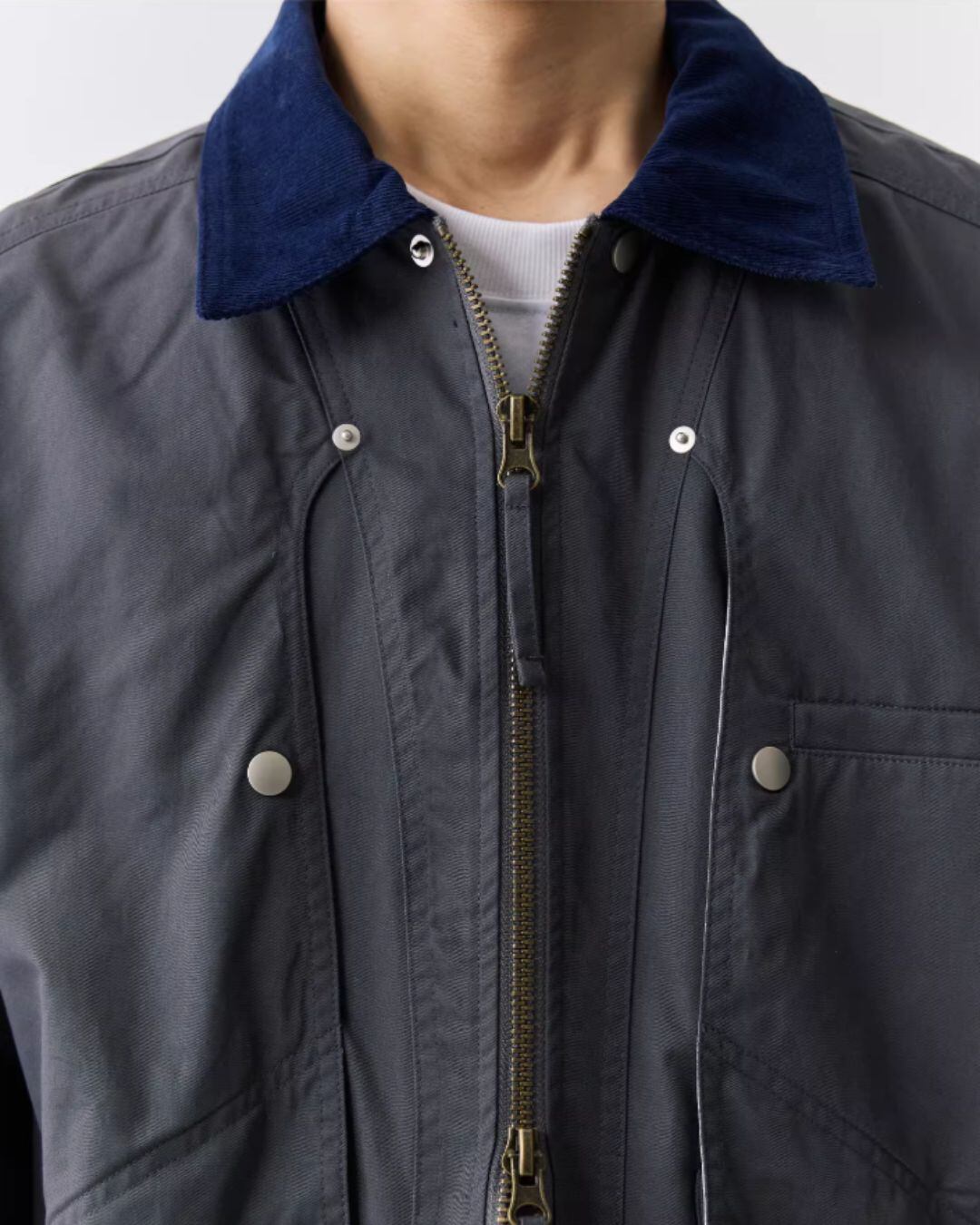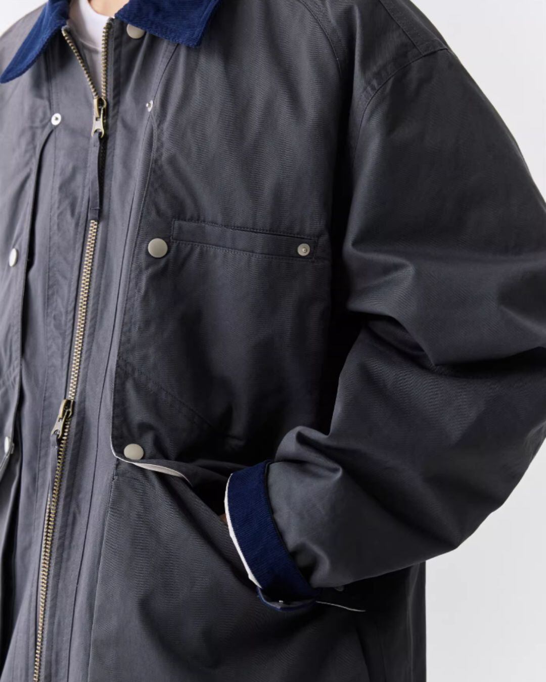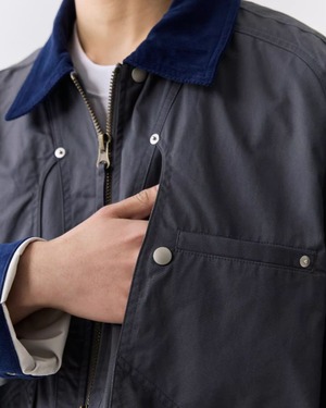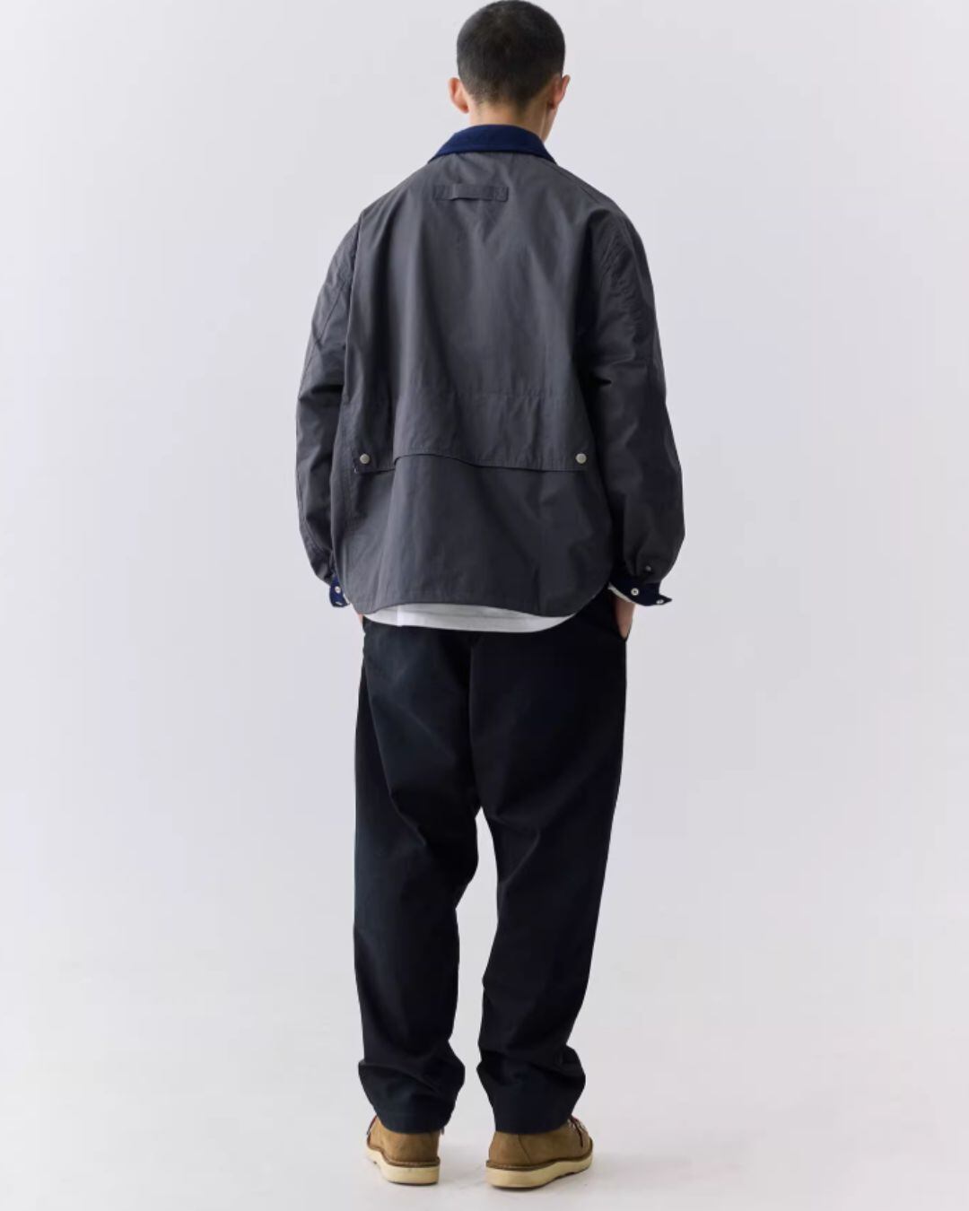 ラペルデザインが特徴的なハンティングジャケット。フロントのフラップ付きポケットは収納力が高く、デザインのアクセントにもなっています。