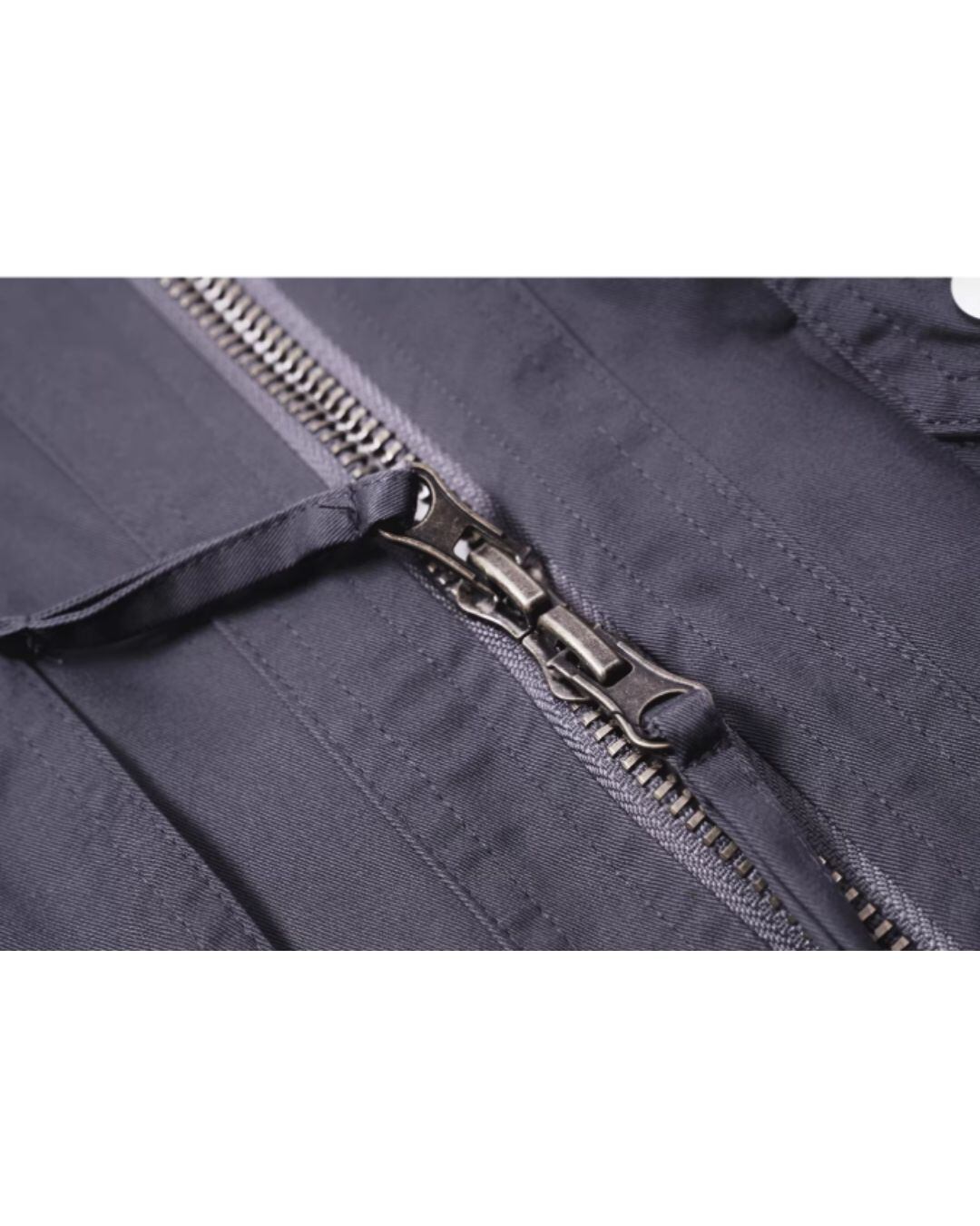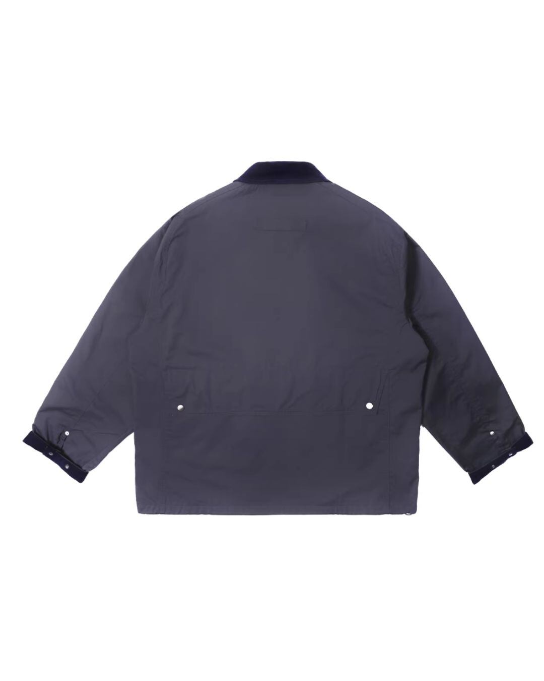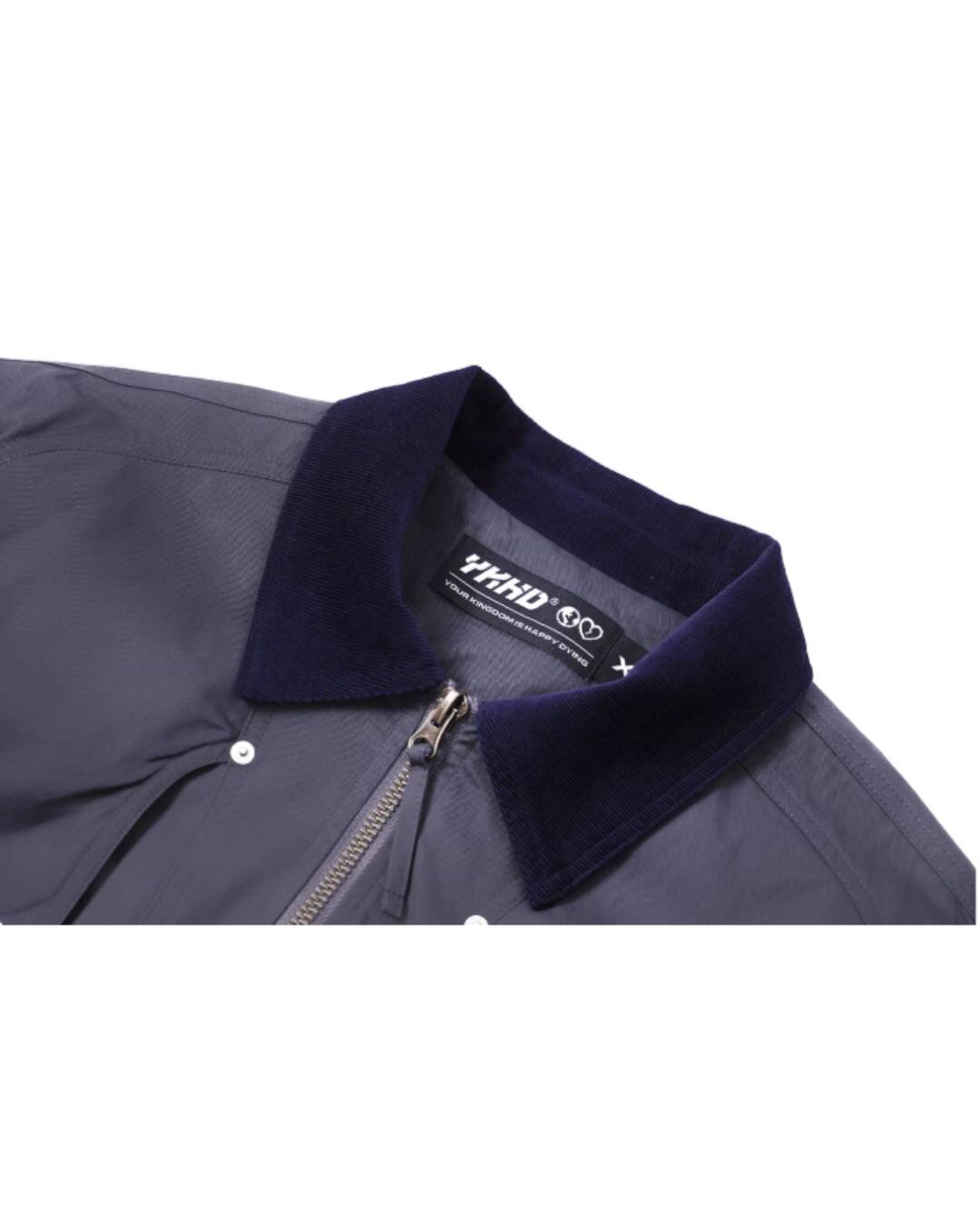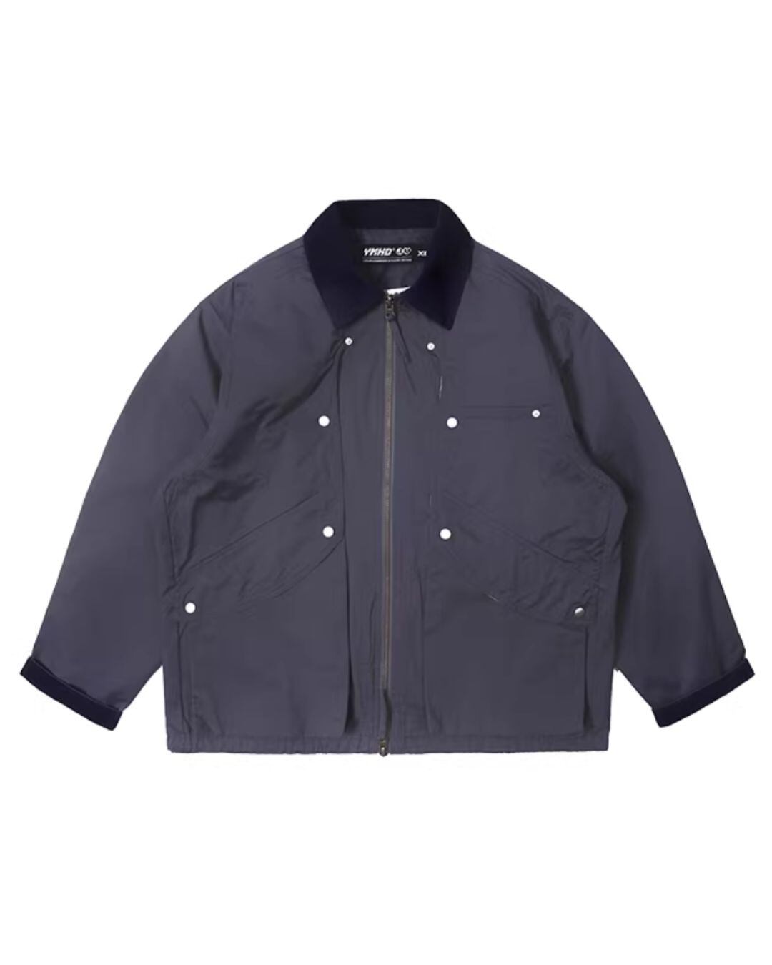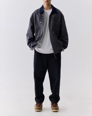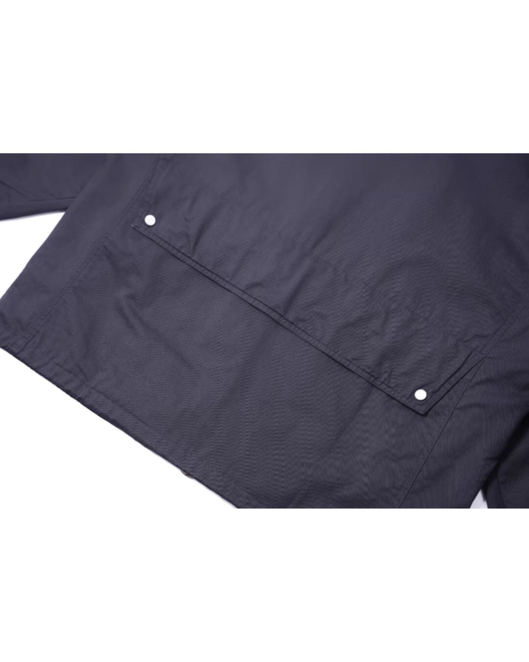 ラペルデザインが特徴的なハンティングジャケット。フロントのフラップ付きポケットは収納力が高く、デザインのアクセントにもなっています。