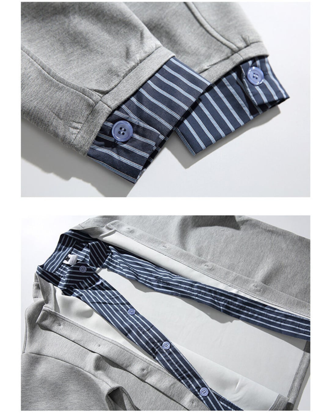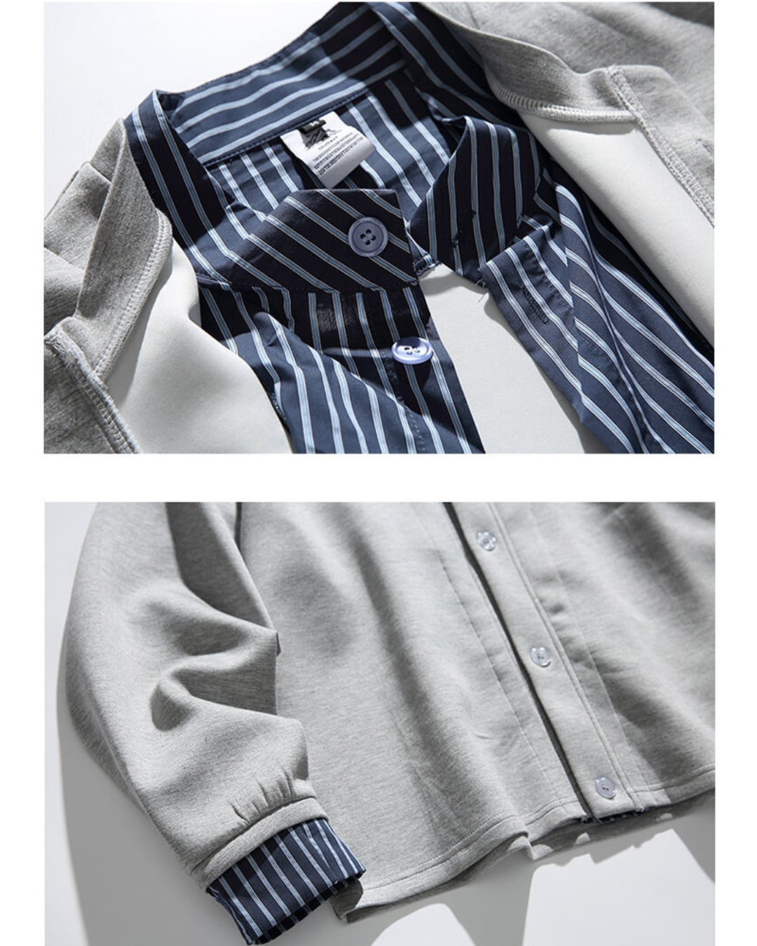 フェイク襟・袖デザインが目を引く、レイヤード風カーディガン。