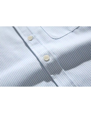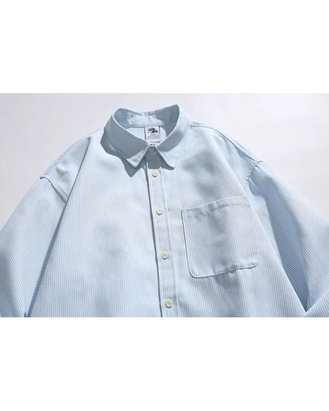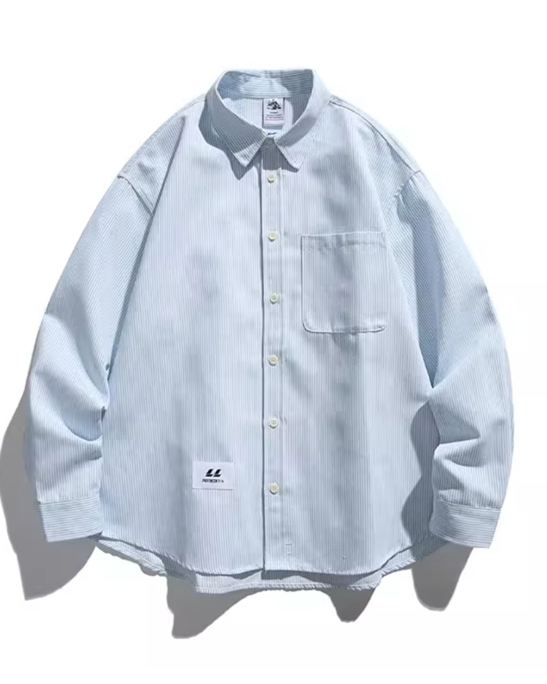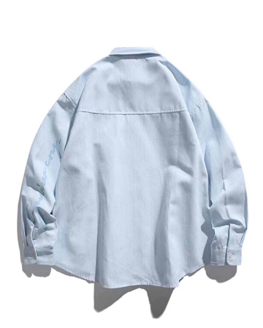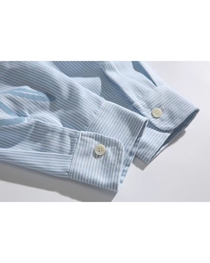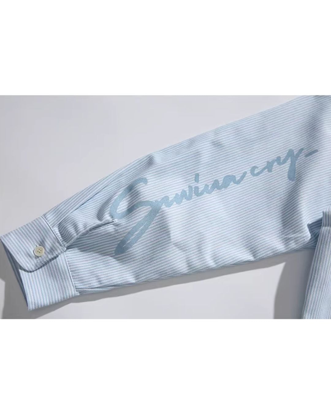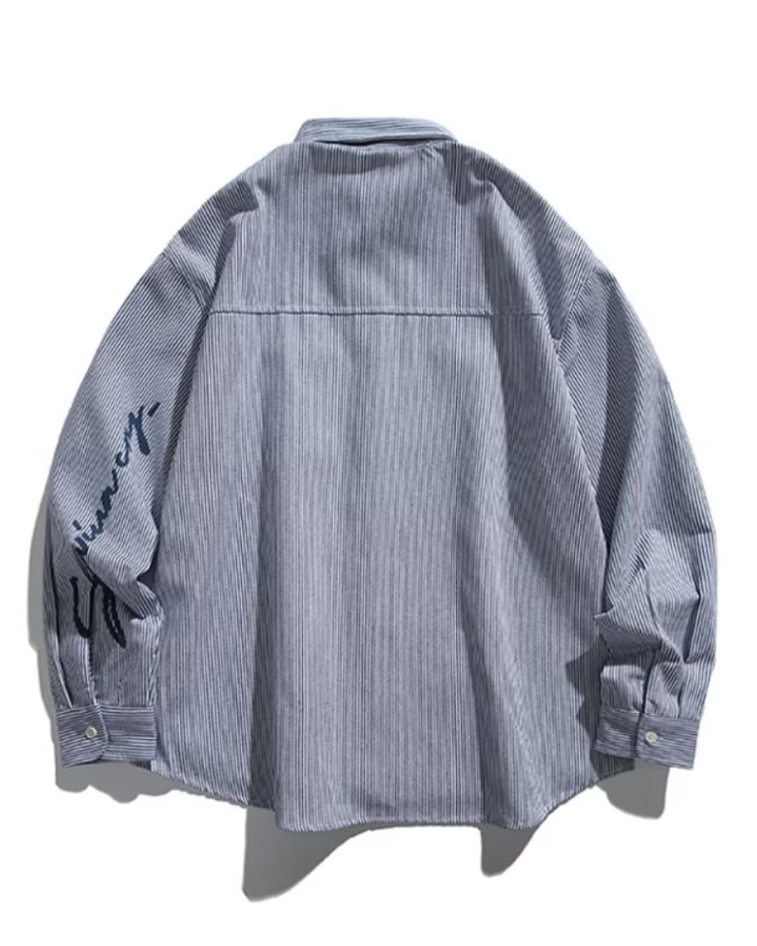 爽やかなストライプが目を引く、オーバーサイズシャツ。袖に走る英字の筆記体デザインが、スタイリングにさりげない個性をプラスします。ルーズなシルエットは、トレンド感のある着こなしに最適です。